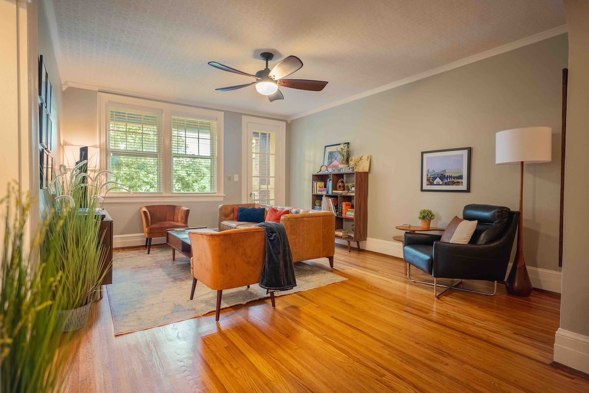 This gem nestled away in Chattanooga features stunning views of the Tennessee River. The fully furnished apartment contains everything you need for a relaxing stay. You won’t get tired of exploring the little touches the apartment holds and taking in the original historic features the building holds for it’s guests. Two beautiful living spaces offer you and your guests places to have conversations or settle in on the couch after you’ve spent the day exploring the beautiful river valley!
