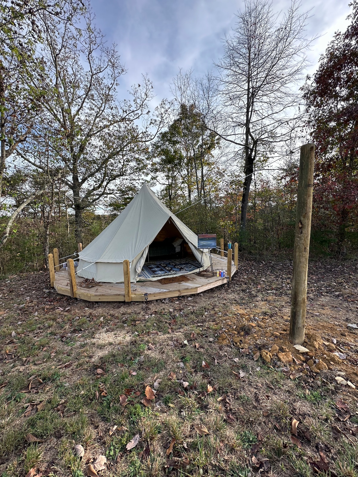 Come stay in our handcrafted glamping tent, built with traditional timber-frame joinery and wrapped in the beauty and whimsy of breathable cotton canvas. Breathe in. Draw near. Be still. Watch morning mist drift through the valley from your front porch. Take a nap as sunlight dances across the canvas. Soak in the sounds of birdsong and breeze while reading a good book. Nearby adventures: 15 min – Indian Mtn. Park 40 min – Norris Lake 45 min – Cumberland Falls 2 hr – Great Smoky Mtn. Ntl. Park