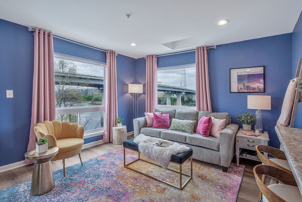 Walking distance to everything Nashville! Enjoy a stylish experience at this downtown, one bedroom condo with a porch overlooking the Cumberland River in the heart of Music City. POOL, GYM, FREE parking, only one mile to Broadway, and just a few blocks to live music, bars, dining, Germantown, the Capitol, the Nissan Stadium, the Nashville Sounds stadium, Top Golf and more. A fun and newly renovated space. The condo is set up with your comfort and convenience in mind with photo opportunities!