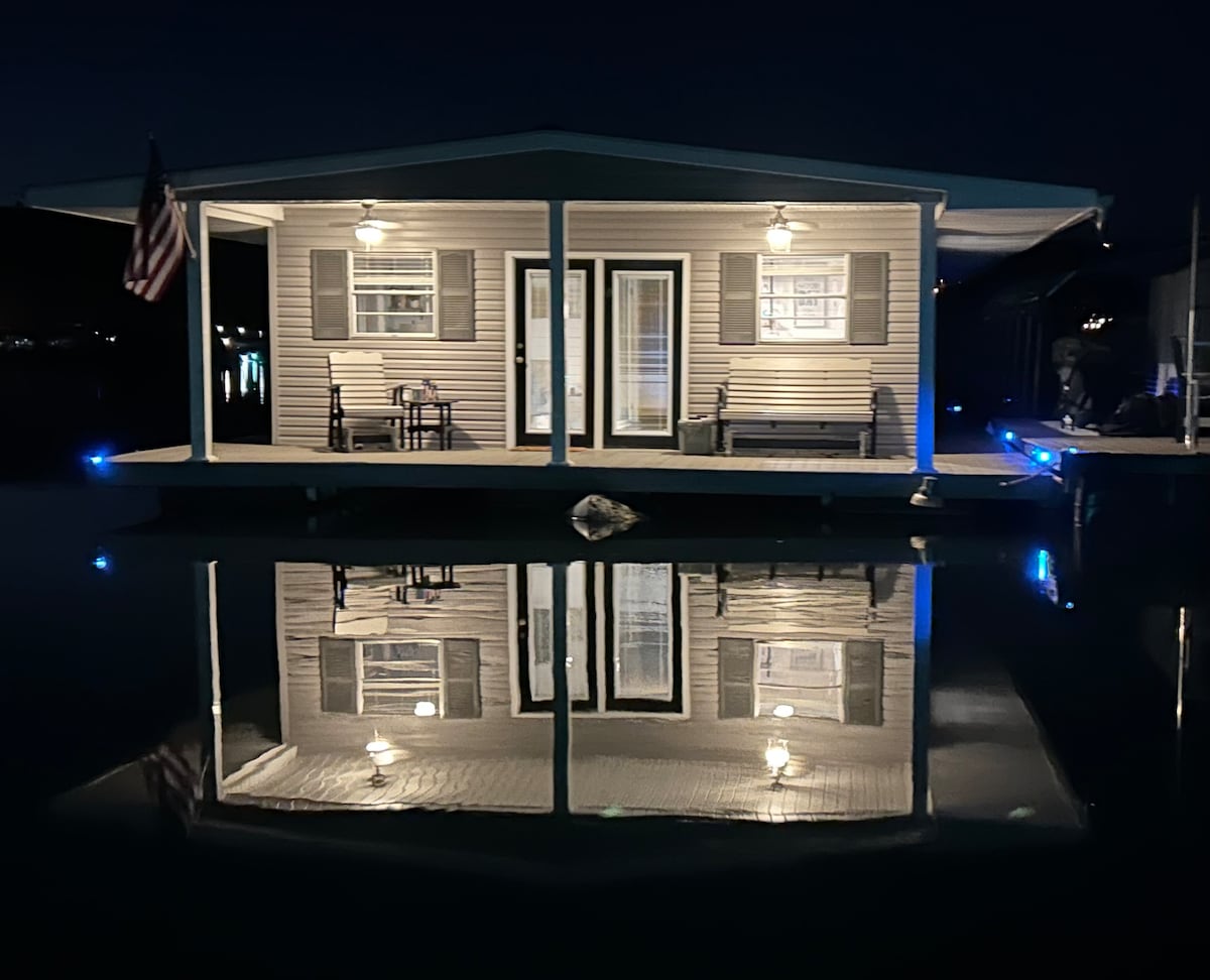 Lovin’ the Lake Life – Leave the crowds behind at this unique vacation stay, a 3 bd home surrounded by & FLOATING on water, yet firmly grounded & packed with every amenity to make your trip complete! Wake up to wide open views of the water from every window and start your day relaxing on the front deck enjoying your early morning coffee. Spend the afternoons exploring the coves and cozy inlets on our pontoon boat or bring your own & park it under our private covered boat slip.