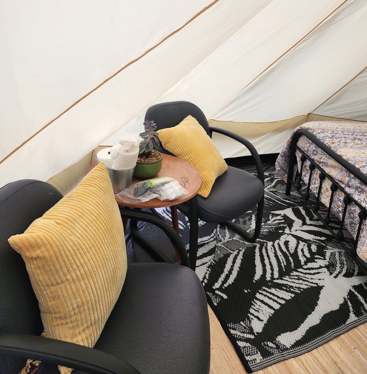 Get away from it all when you stay under the stars! This lovely canvas tent has a comfy queen size bed, tables and chair with ottoman. There’s outdoor seating on the deck, a table and chairs outside and a lovely spot to enjoy an evening fire! We have an outdoor shower and bathroom for your use along with an outdoor kitchen where we are happy to offer coffee and baked goods for breakfast when available! Please let us know if you’d like those in advance. We also just installed solar power!