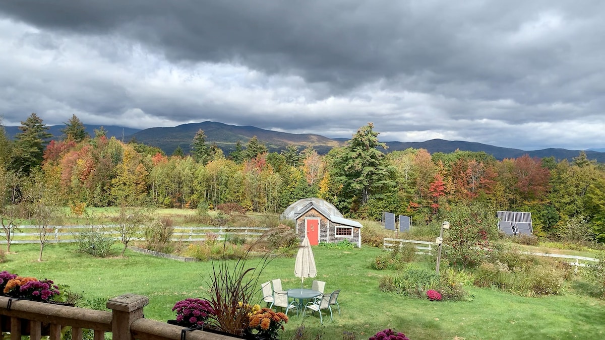 Close to town and I 93, a rural paradise. You have your own driveway and private deck with gorgeous views of hills and gardens. The bed is surrounded by two walls of windows-with shades. There is a Hearthstone gas stove, a loveseat, and a huge custom shower in a modern bathroom. The kitchen has a full size refrigerator, a kitchen counter and sink, a microwave, a blender and crock pot. There is a television with cable, Netflix, etc. We stock coffee, and breakfast foods for your convenience.