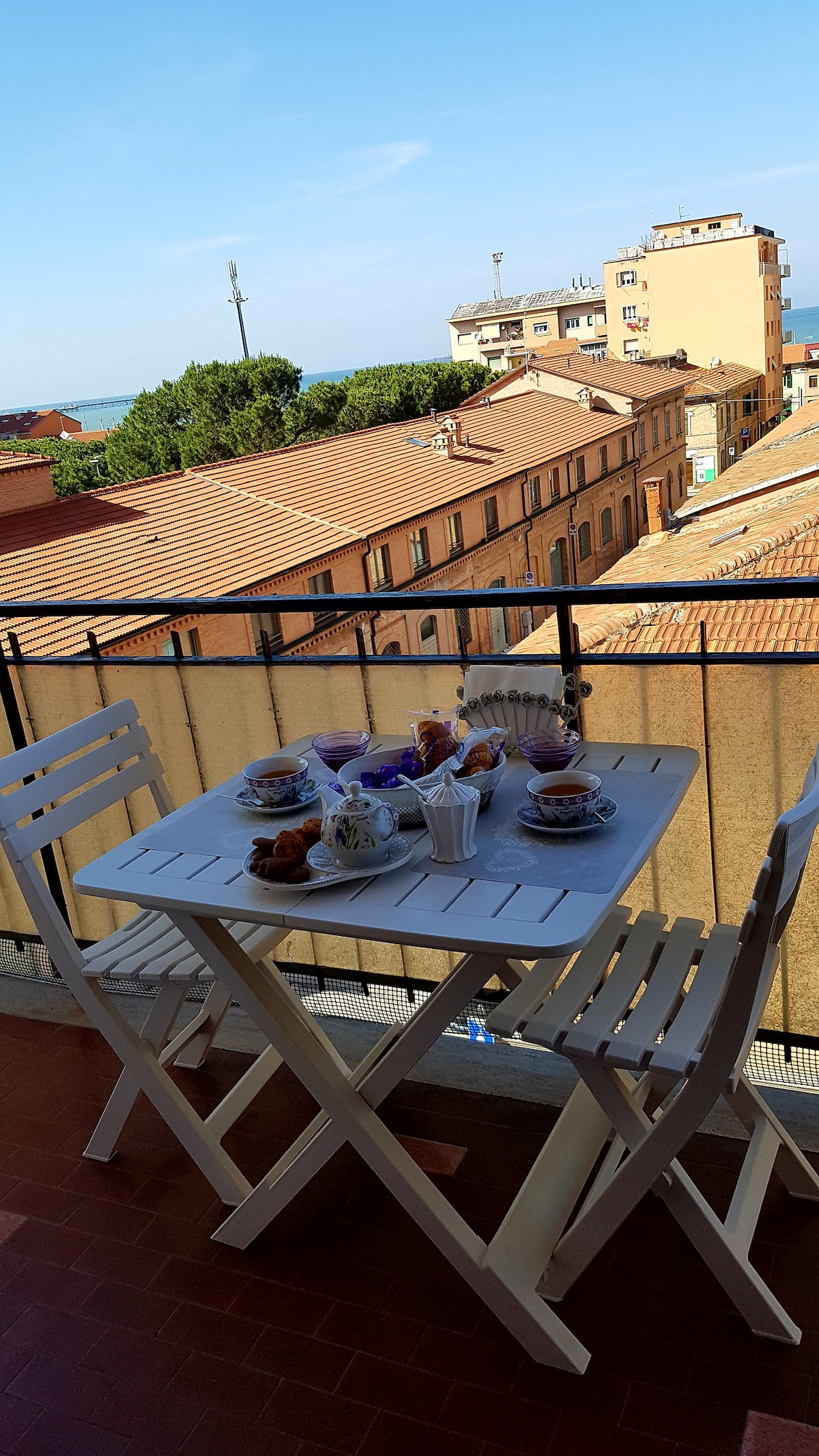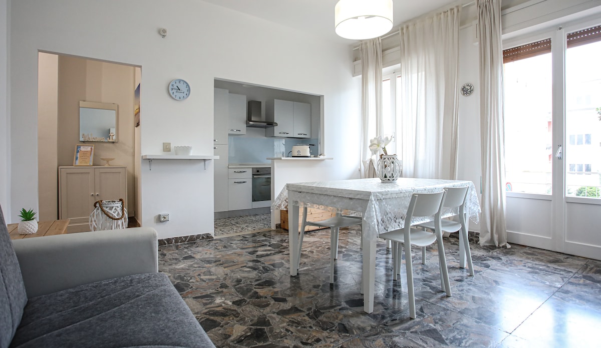 Luminosissimo e centralissimo appartamento di 75 mq, situato al 3° piano di un palazzo con ascensore e vista mare da ogni stanza! Balcone lungo e ampio tanto che ci si può mangiare! Parcheggio disponibile sotto casa e nelle immediate vicinanze. La lunga spiaggia (libera a m. 200 ed attrezzata a m. 350) è agilmente raggiungibile a piedi! IMPORTANTE: l'alloggio è tutto in piano (non ci sono salite da fare per raggiungerlo!) e NON SI TROVA A RIDOSSO DELLA FERROVIA, quindi...tranquillità, no rumori!