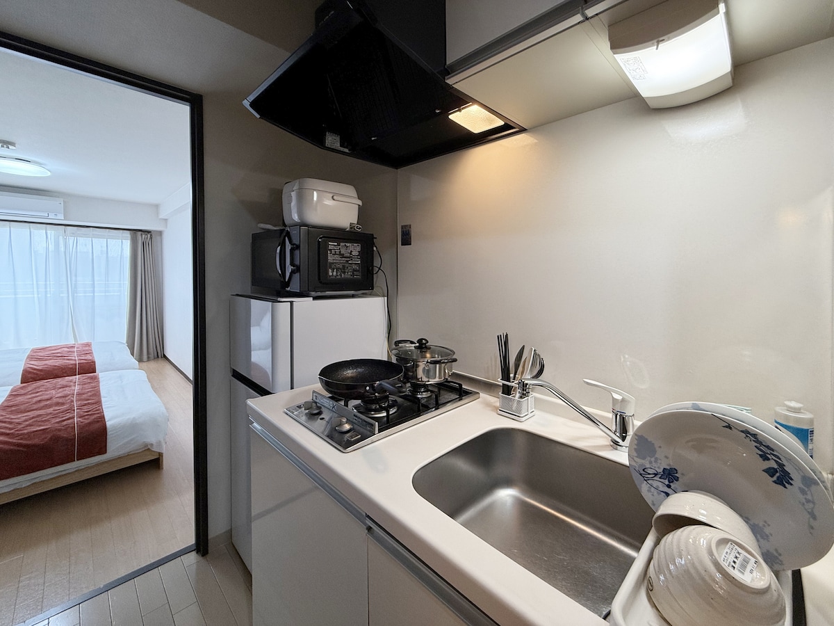 通天阁店无人公寓酒店! 通天阁:步行5分钟,随时领略大阪地标美景。 日本桥电器街:步行10分钟,购物天堂一览无遗。 道顿堀:乘地铁2站即达,尽享美食和购物乐趣。 心斋桥:乘地铁3站,时尚购物中心,满足购物欲望。 大阪城公园:地铁15分钟车程,历史与自然的完美结合。 环球影城:地铁30分钟车程,欢乐无限,适合全家出游。 公寓为您提供一流的居住体验。卧室配备高档大号床,确保您每晚都能享受优质睡眠。客厅装饰现代,配有沙发和平板电视,是您放松身心的理想场所。 全套厨房设备,包括冰箱、微波炉、烤箱、电磁炉和咖啡机,让您在旅途中也能享受烹饪的乐趣。 浴室提供24小时热水、洗漱用品和吹风机,让您在忙碌的观光后享受舒适的沐浴时光。全屋高速免费Wi-Fi、空调、洗衣机等设施一应俱全,满足您所有的居住需求。
