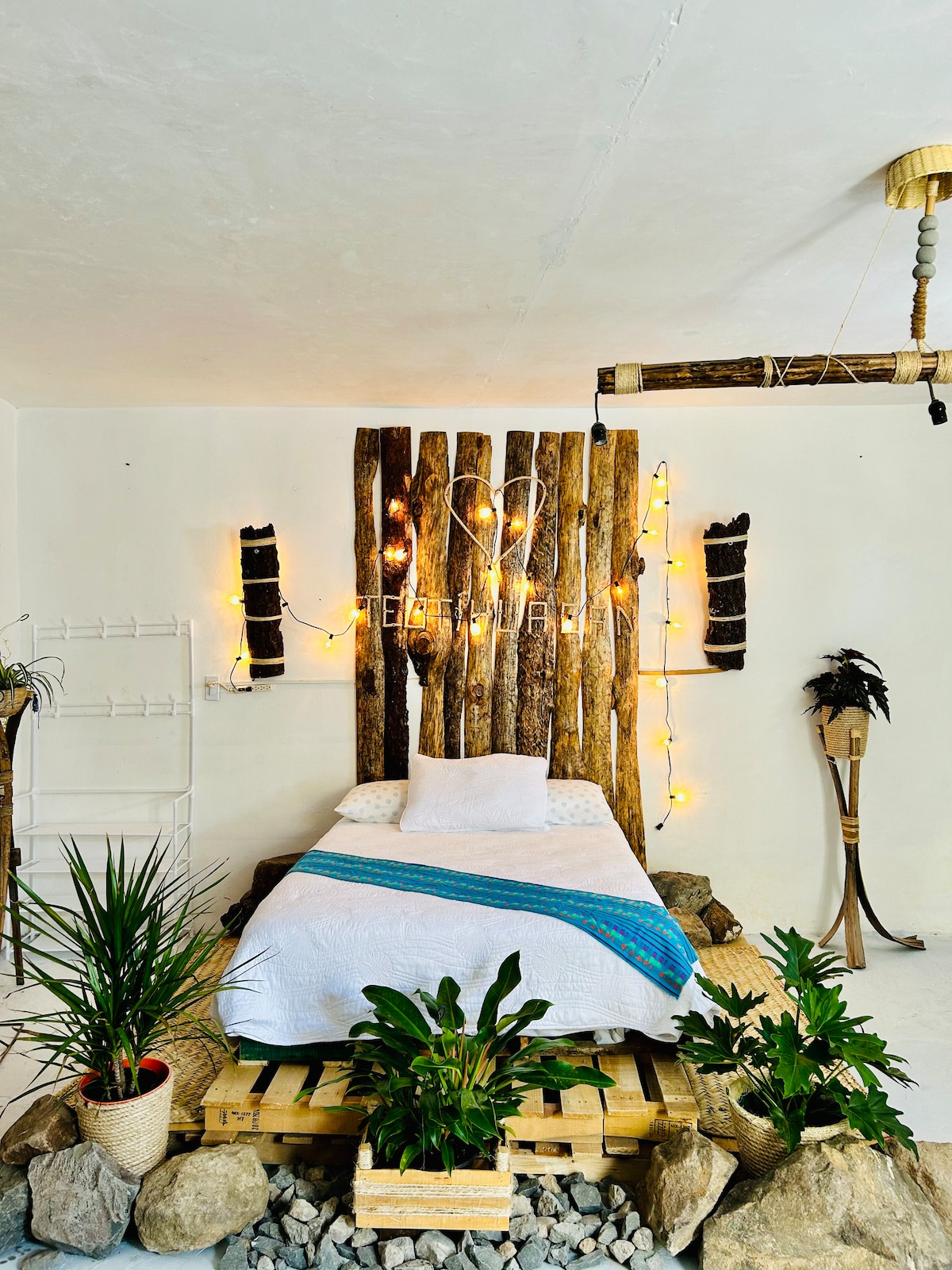 Bienvenidos al Loft Suite Amoxtli, espacio que integra las comodidades del descanso con elementos ideales para el estudio o trabajo. Ubicado en el centro de San Juan Teotihuacan, este alojamiento es ideal para relajarte durante tu visita, o para estancias largas por motivos de trabajo. Edificado en la planta alta, es el hospedaje más acogedor y con un diseño único en Teotihuacan, gracias a sus elementos naturales como la madera, detalles en talavera y a las artesanías que le dan autenticidad.