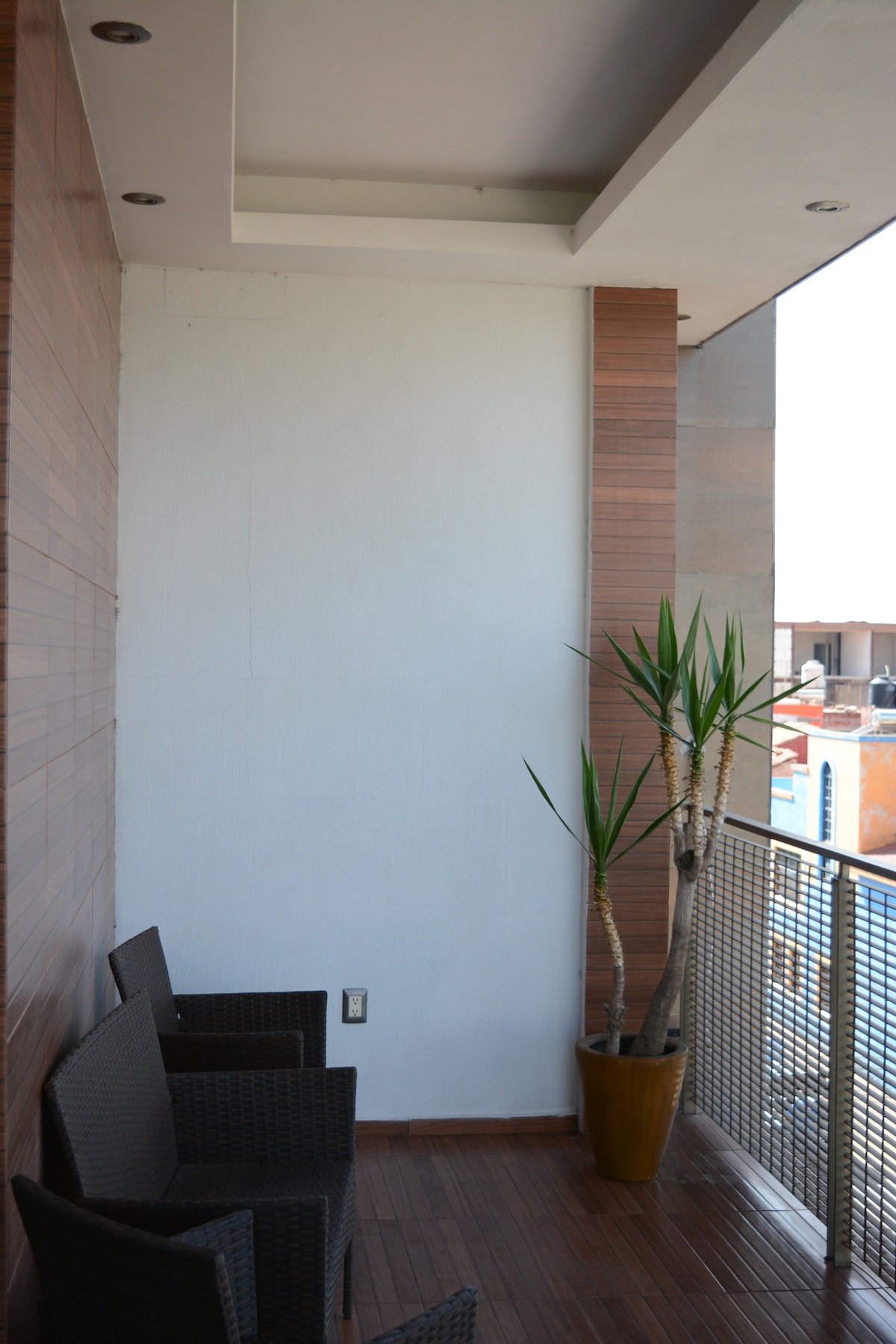 Pequeño departamento tipo loft con 1 cama king size, cocineta con estufa eléctrica, lava trastes, microondas, frigobar y utensilios básicos de cocina (cucharas, cuchillos, vasos, tazas, etc), comedor, estancia, tv, maletero, mueble para colgar y doblar ropa, baño completo y balcón con increíble vista panorámica. Además el rooftop que está en el último piso está disponible para todos los huéspedes, ahí podrás tener una maravillosa vista panorámica de la ciudad y ver el bello atardecer 🌅