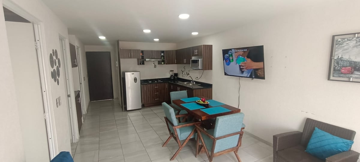 (FACTURO el TOTAL Encantador departamento te ofrece la combinación perfecta de tranquilidad, diversión y urbanidad, ubicado en una zona muy privilegiada a unos metros de las principales avenidas, lo cual te da acceso a los mejores restaurantes de la cuidad , Walmart, casino, bares, central camionera, núcleo textil Estamos ubicados sobre el parque lineal, por lo que podrás realizar caminatas 🌳matutinas de 1.4km o un lindo picnic con tu pareja con la canasta 🧺 especial que te prestamos🍷