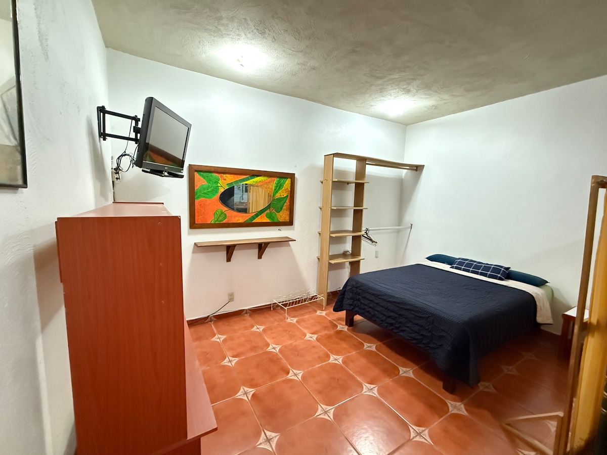 Acogedor apartamento tipo estudio completamente independiente, con sala, comedor y cocina. Ideal para un viaje de descanso o de trabajo. A sólo un par de cuadras del libramiento de Tepic, y a tan sólo 8 minutos del Parque Ecológico y del Tecnológico de Tepic, a 15 minutos de Plaza Forum, o a 15 minutos del centro histórico. En una zona residencial muy tranquila y familiar. Cuenta con una cama matrimonial y sofá cama. Smart TV, Wi-Fi, Cocina con estufa eléctrica, cafetera y mini-refrigerador.