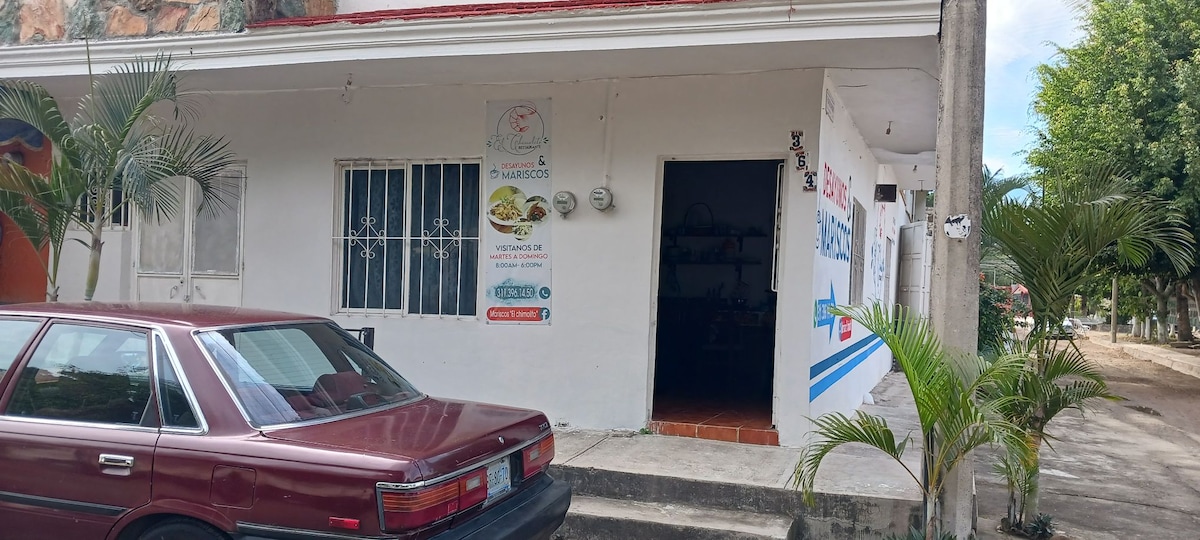 Lindo e iluminado departamento, en segunda planta, muy cerca del centro de Tepic, cuenta con una recámara con dos camas matrimoniales para que descansen 4 personas cómodamente; tiene una cocina-comedor con estufa, refrigerador, mesa, sillas, fregador y pequeña vajilla; hay un pequeño patio con lavadero; está un baño completo para uso de los huéspedes.