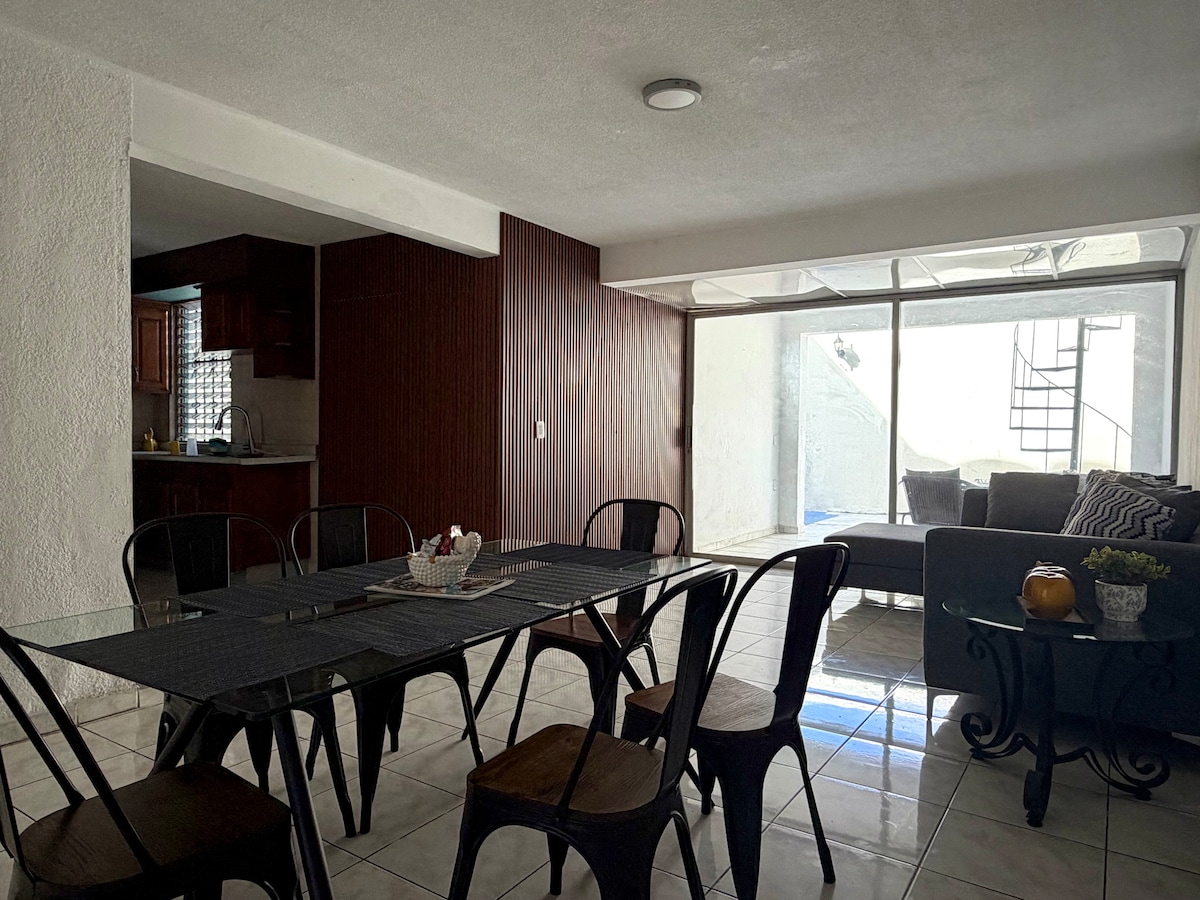 Estancia segura para ti y tu familia, en un espacio agradable y acondicionado para disfrutar de la ciudad en un viaje de placer o de trabajo. Cuenta con 2 recamaras con cama queen y matrimonial, 1 baño completo, sala con televisión, comedor, cocina equipada, patio con artículos delimpieza, cochera con portón cerrado para tu privacidad y una mesa exterior. La colonia es tranquila, a 5 minutos del centro de la ciudad y cerca de hospitales como Puerta de Hierro y, auditorio Amado Nervo, plaza Forum