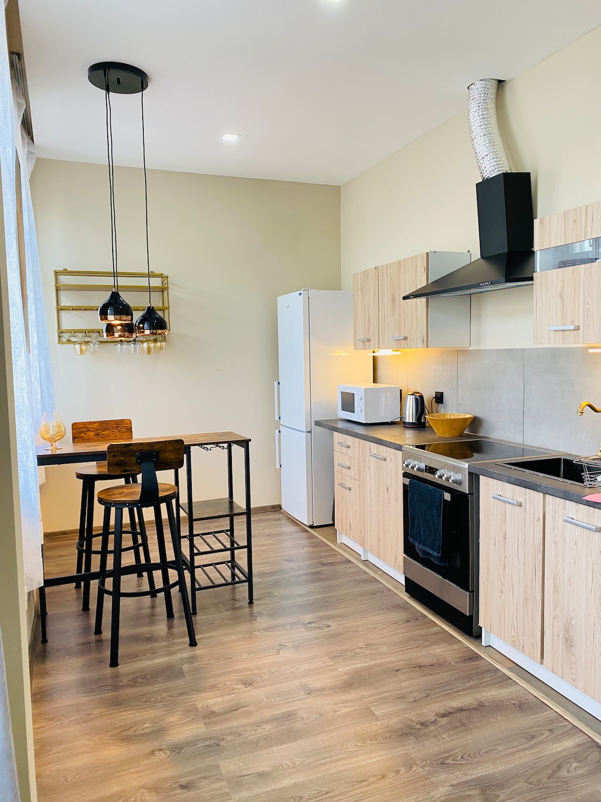 The apartment on the top floor is truly unique. It is located on the second floor and and the entire place has been restored to original building. The original roof wooden frame, exposed brickwork, original flooring, fully functional wooden stove helps you to imagine what people lived like at the beginning of last century. The main living area is facing the front of the house and therefor you will find a view on the town square, town house and the famous basalt rock “Jehla”.