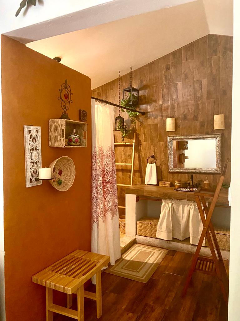Loft de Origen hace honor a su nombre por estar construido con adobes fabricados en sitio con las técnicas ancestrales y con la misma tierra del lugar donde se encuentra. El espacio tiene doble altura y techos con vigas de madera. Vivir y dormir en un espacio hecho de tierra natural te acoge y armoniza con tu propio origen. Despierta con la caricia del sol de la mañana entrando por el jardín y disfruta el atardecer mirando al pueblo de noche por el gran ojo de la recamara en el mezzanine.