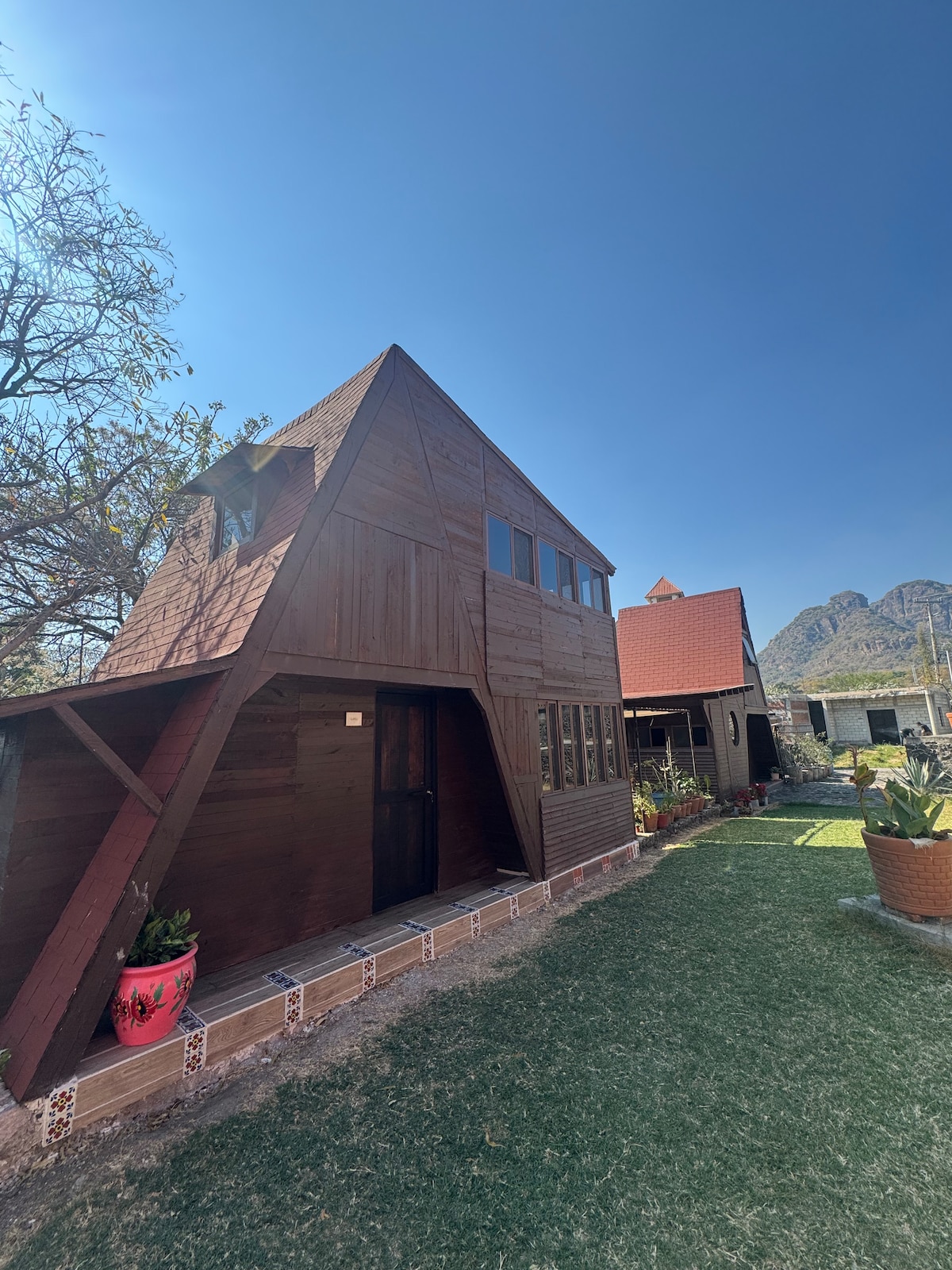 Ubicada en el simbólico cerro del Chalchitepetl, el cual es una reserva ecológica, permite disfrutar de panorámicas privilegiadas al Tepozteco y pueblo de Tepoztlán. Cuenta con todas las comodidades que permiten hacer una estancia inolvidable Por ser un cerro, se tiene que subir y luego bajar una calle empedrada Cuenta en área común un asador, jardín y una alberquita (temperatura ambiente) que se comparten con huespedes de un chalet que también se renta Ambos tienen privacidad
