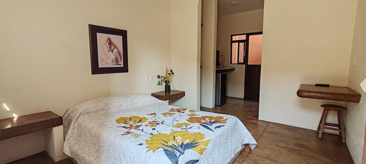 Experience the charm of Cuernavaca in a unique and cozy room. Our space features a comfortable queen-size bed and handcrafted wooden furniture, all within a setting that blends traditional Mexican architecture with artistic details, creating a warm and authentic atmosphere. You’ll be just minutes away from Cuernavaca’s Historic Center, the Borda Garden, Robert Brady and Museum. Only a 30-minute drive takes you to Tepoztlán, one of Mexico’s most enchanting Pueblos Mágicos.
