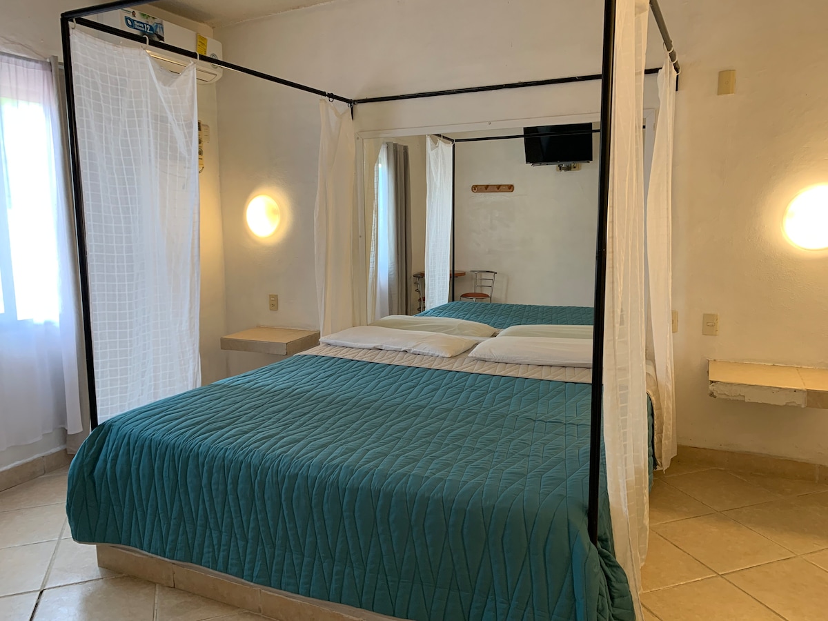 Bungalow independiente en segundo piso con dos camas matrimoniales, baño propio, aire acondicionado, balconcito y cocineta.