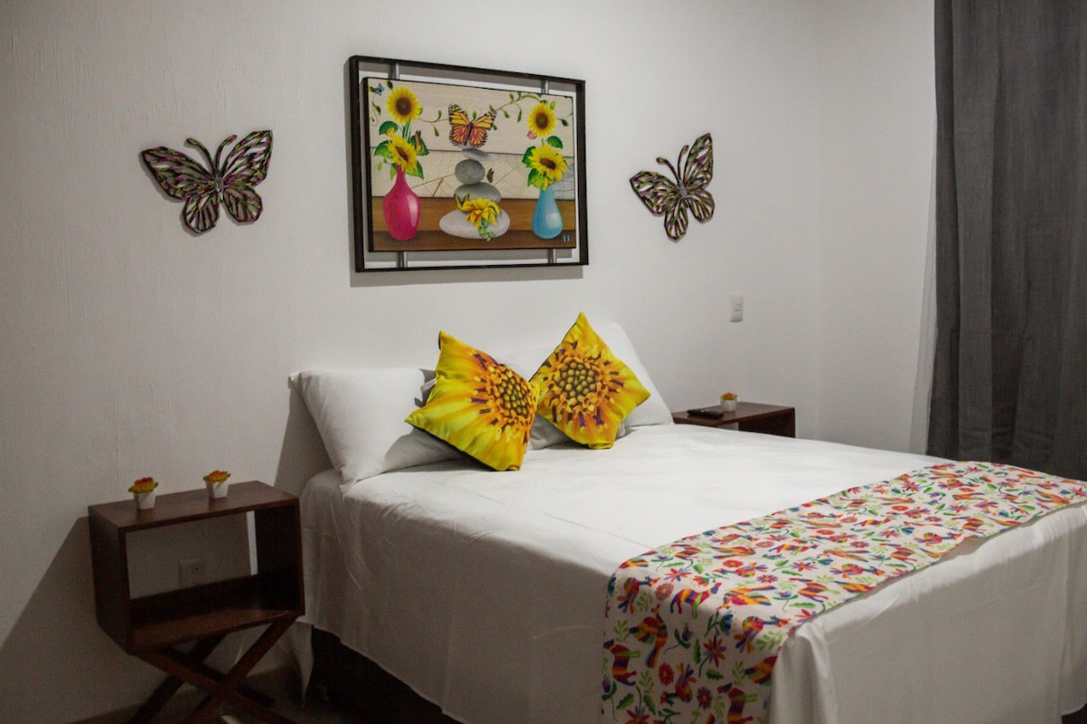Disfruta de la experiencia de venir a Tequila y estar en el corazón del pueblo, dónde te divertirás 🍽️🍻🌭🍔. Este departamento cuenta con A/C ❄️, terraza para pasar la tarde, vista panorámica del centro del pueblo y del volcán de Tequila. Este pequeño espacio te ayudará a descansar después de un día extenuante al conocer el pueblo. 2 recamaras matrimoniales, 2 baños completos. No hacemos discriminación, por tu color de piel, etnia, religión y preferencia sexual. Aceptamos mascotas.