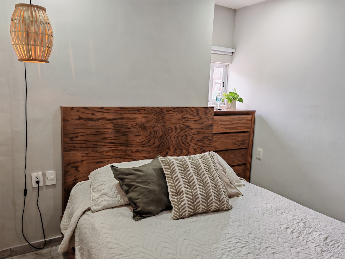 Estudio con cama king Size, cuenta con todos los servicios, se puede proporcionar colchon individual extra. Agua caliente, cafetera dolce gusto y café, frigobar, baño propio, closet con ganchos de madera, televisión por cable y wifi. Estacionamiento con reja, asador, mesa exterior. Árboles frutales. A 10 metros de panadería y a 10 minutos del centro a pie.
