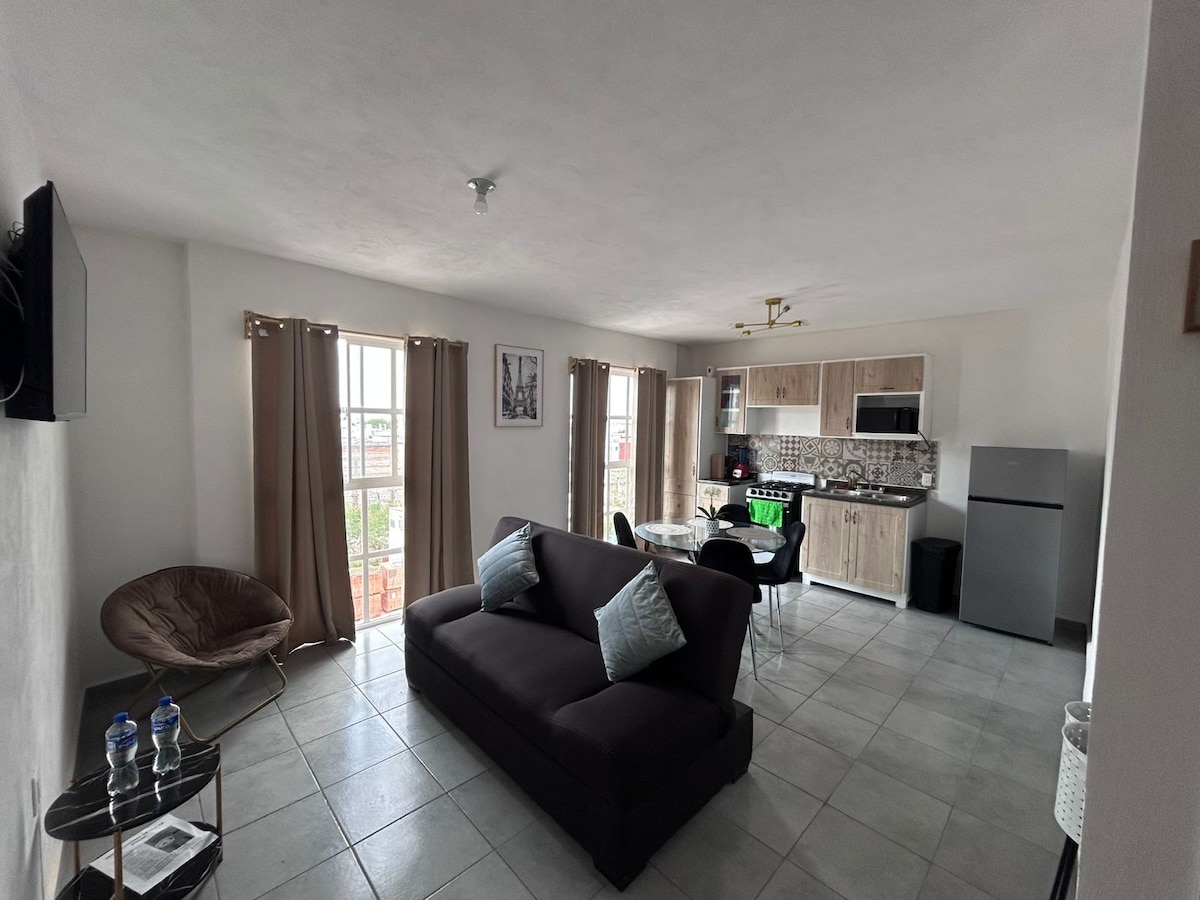 Relájate en este nuevo departamento donde la tranquilidad y la Navidad se respira ; excelente ubicación, a 6 min del centro de Tequisquiapan, 26 min a Freixenet y Real Fábrica de Tabaco Black Chazaro en auto, muy cerca de otros viñedos, cava de quesos, balnearios y más lugares para pasear. Alójate en un lugar seguro en el corazón de la ruta del queso y del vino. Cochera para un auto. Cuenta con una recámara con cama king y una cama individual plegable, perfecto para 3 personas, balcón y terraza.