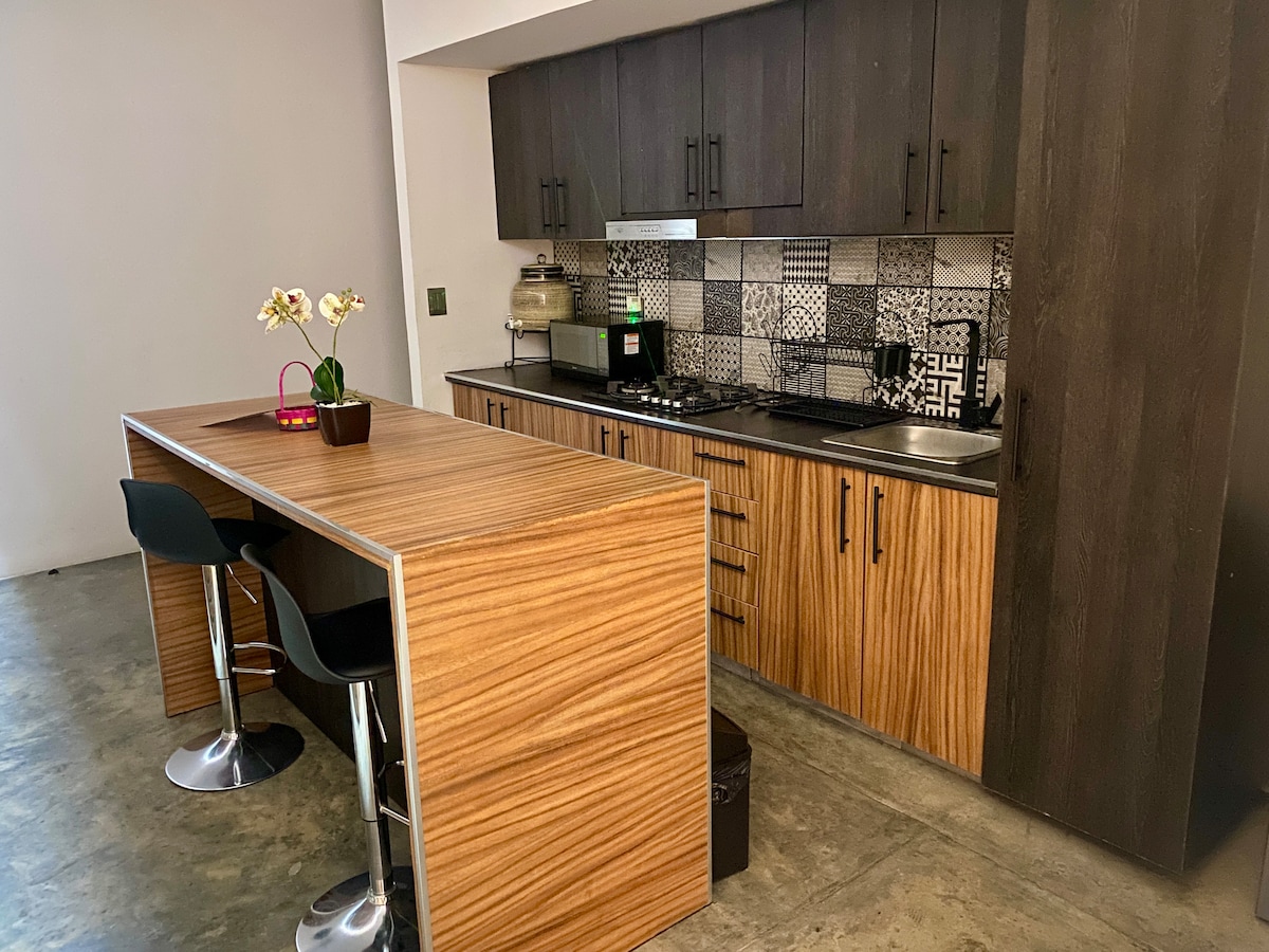 Disfruta de la sencillez de este alojamiento tranquilo y céntrico a unos pasos del centro de Tequisquiapan. El mini depa está distribuído en una sóla habitación (tipo estudio) con cocineta, mini refri, baño con regadera, sofa cama y cama doble. Con capacidad de alojamiento hasta para cuatro personas. Tequisquiapan es un pueblo mágico en donde encontrarán un sin número de actividades por descubrir del turismo del vino y del turismo wellness, reconocido internacionalmente.