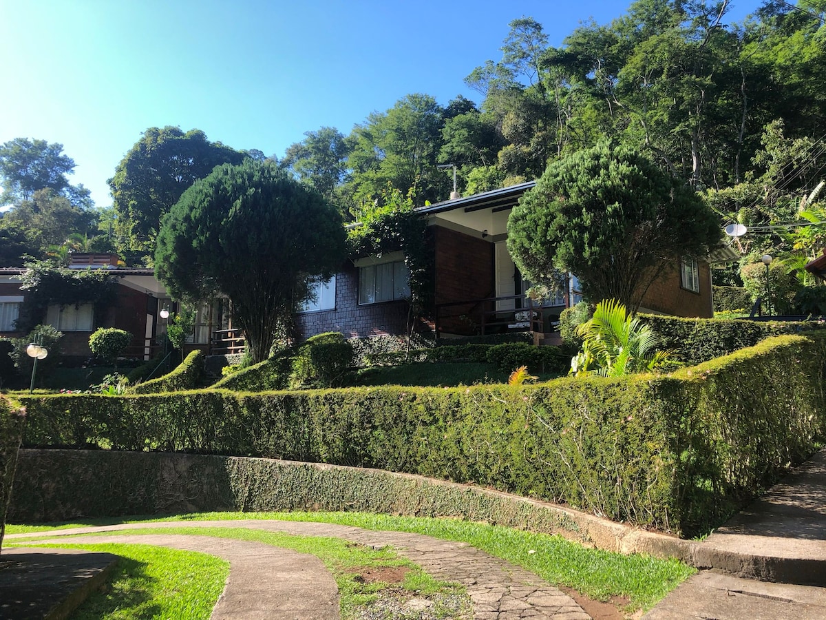 A Cabana da Serra RJ foi pensada para proporcionar aos hóspedes uma experiência única com cinema ao ar livre, hidromassagem, churrasqueira e lareira para os dias frios. Juntamos o máximo de conforto e privacidade para que você aproveite sozinho(a), com seu parceiro ou parceira, em família ou entre amigos. A casa está localizada em um condomínio com academia, quadra de areia, parquinho e lareira de chão. Fica (de carro) a 15 minutos do Centro e 21 minutos do Alto.