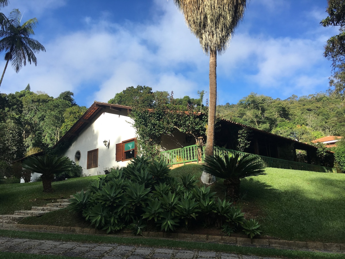 Linda casa rústica em Teresópolis em enorme terreno com piscina, churrasqueira, jacuzzi, lago natural, árvores frutíferas e quadras. Toda decorada com móveis, ampla varada com mesa de sinuca, totó e ping pong. Café da manhã incluído na diária. Capacidade para 22 pessoas, através do uso da casa principal e chalé.