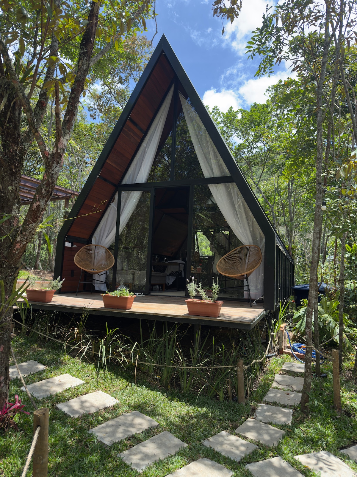 O Chalé Araçás é um refúgio exclusivo em meio à floresta, próximo a uma represa, perfeito para quem busca conexão com a natureza sem abrir mão do conforto. oferece banheira, cinema ao ar livre, pergolado, deck, fogo de chão, churrasqueira e chuveirão externo. Por dentro, une luxo e rusticidade em um ambiente acolhedor e sofisticado.