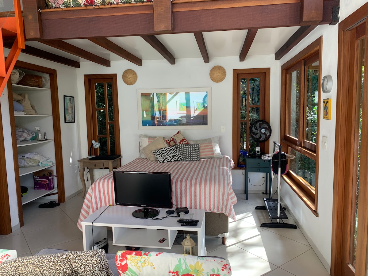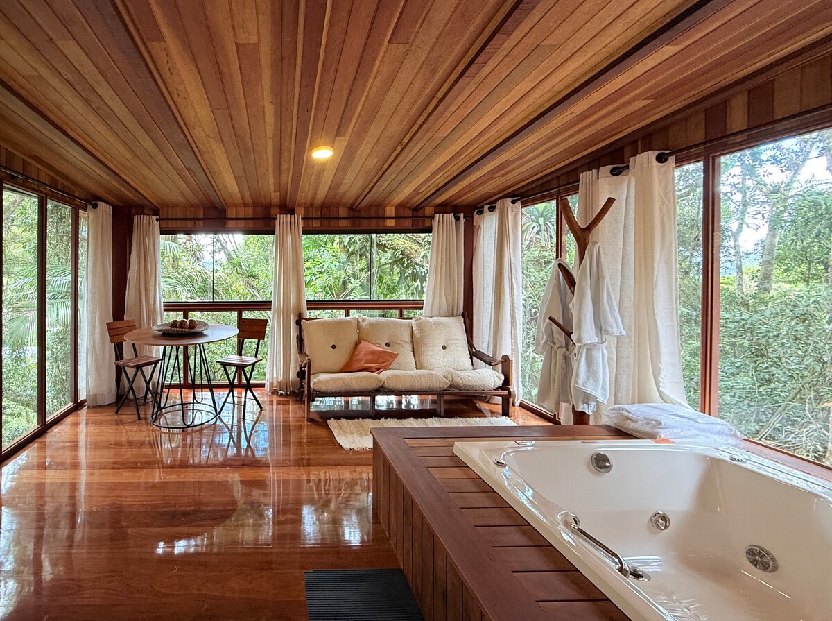 A chalet inserted in the Atlantic Forest, in a region of environmental preservation, where recovering energy and resting is the rule. This is how we present Chalé Maritaca, named for the existence of this bird nearby. Coziness was our goal, being a chalet with a fireplace, hot bath, and more, in addition to a beautiful green area. Staying here is enjoying the concept of "life in the countryside," in a lot of nature, tranquility, and peace under a spectacular starry sky. Make yourself at home!