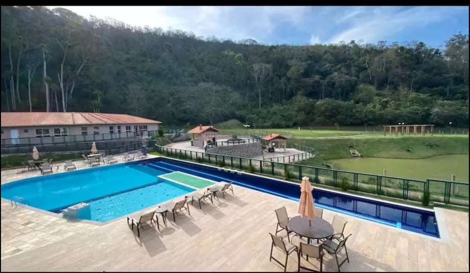 167.000 m² de lazer-Acomodando até 17 pessoas sobre camas. Muito verde, propriedade extremamente acolhedora, acomodações confortáveis. Lagos e piscina, abastecida com água cristalina direto da mina d'água, casa na árvore (decorativa), belo gramado, balanços, churrasqueiras, forno caipira, bote para passeio no lago, peixes, campinho etc. Não é condomínio, espaço 100% privativo, exclusivo para você, sua família e seu grupo. Casa totalmente mobiliada, equipada, oferece maior conforto aos hóspedes.