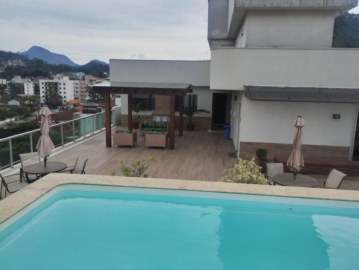Relaxe neste espaço calmo e cheio de estilo. Estamos proximos aos principais pontos turísticos de Teresopolis. Deixe seu carro na garagem e conheça caminhando o restaurante Vila St. gallen, ( fica na esquina ) a 10 minutos desfrute a Feirinha do alto e do Restaurante Viva Italia, a 15 minutos do parque Nacional Serra do Órgão , a 20 minutos da Granja Comary. Aprecie na cobertura do predio a belissima vista para o Dedo de Deus!