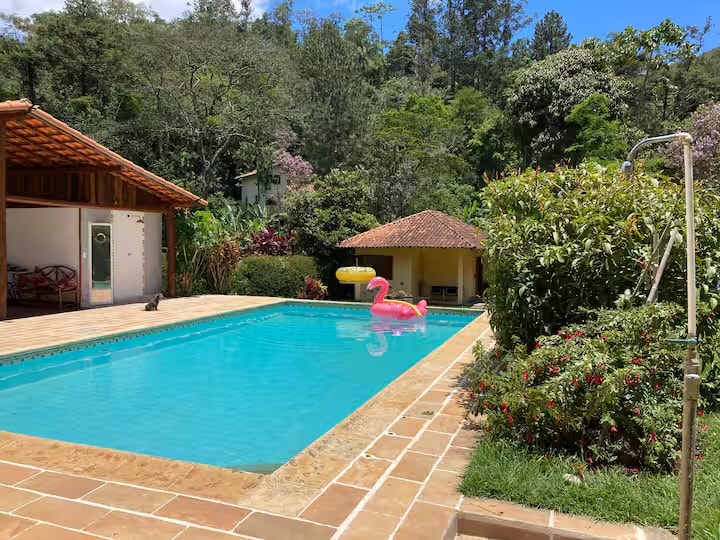 Bem-vindo ao nosso refúgio da serra, onde a natureza se funde com a comodidade. Nosso Airbnb oferece um cenário incrível , cercado por vegetação exuberante, com piscina , churrasqueira, fogueira ,quintal espaçoso. A acomodação é uma casa de hóspedes independente, situada no mesmo terreno da casa principal. Os espaços são bem distribuídos e a área externa com jardim e piscina é totalmente privativa para os hóspedes, oferecendo bastante privacidade e sossego Somos totalmente pet friendly