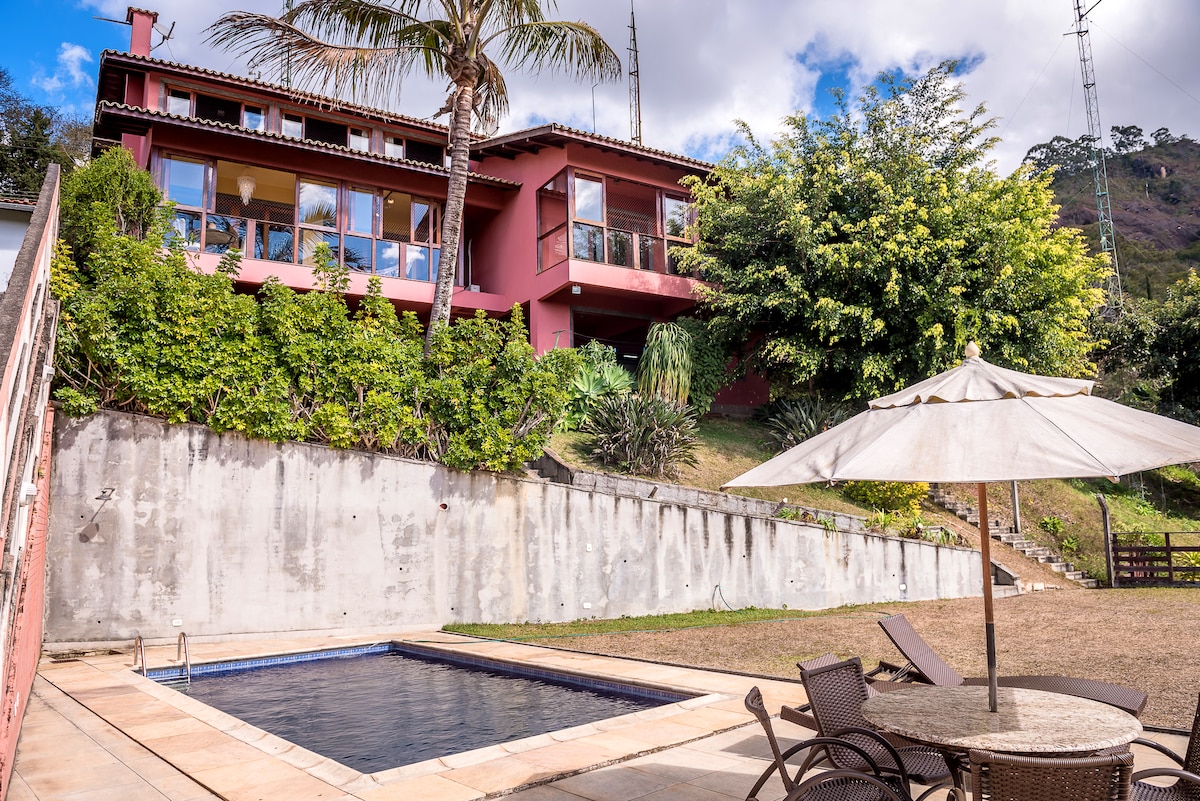 Casa de 400 m2 em área com acesso controlado por guarita, com a paz e tranquilidade que a região serrana de Teresópolis pode proporcionar e inúmeras atividades de lazer, dentro e fora da propriedade Piscina, churrasqueira, forno de pizza, mesa de carteado e jogos de tabuleiro, mesa de sinuca e telão para assistir filmes em diversos "streamings" e para assistir seu jogo esportivo favorito. TVs nas 5 suites da casa e na sala de estar. Trilhas e cachoeiras dentro e fora de parques nacionais.