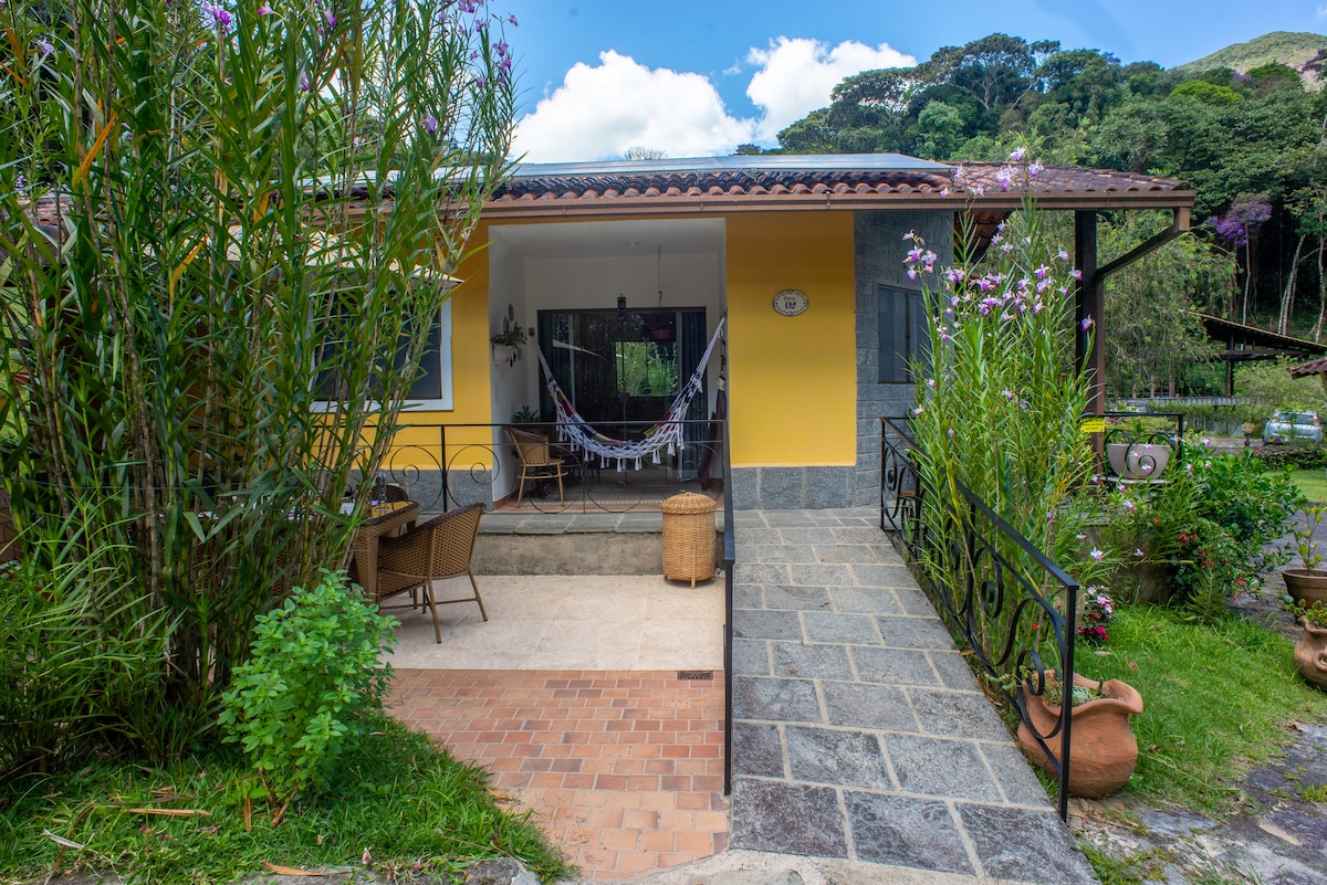 Casa moderna, cercada pelas montanhas da Região Serrana, para quem busca paz, tranquilidade e conforto. Decoração aconchegante e moderna. Smart TV de 75” com home theater. Mini adega para 12 garrafas Ar-condicionado quente e frio, além de aquecedor portátil. Cama queen e sofá-cama. Mesa de jantar, cafeteira Nespresso e elétrica, forno a gás e lava e seca. Banheiro social com aquecimento para toalhas. Vista deslumbrante para as montanhas. Área Externa: Jardim com fonte e espreguiçadeiras.