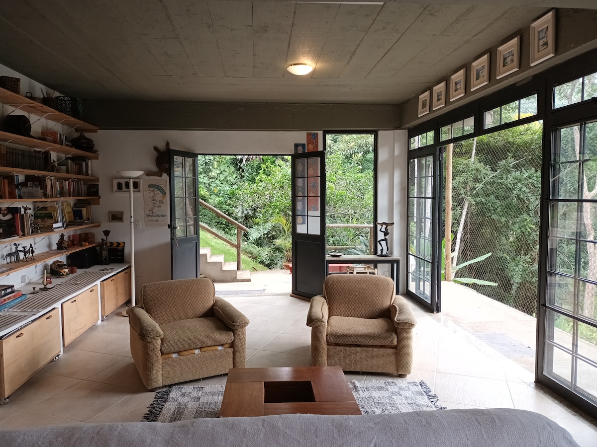 TRABALHAMOS COM NO MÍNIMO 2 DIÁRIAS! DESCONTOS PROGRESSIVOS A PARTIR DE 3 DIÁRIAS! Acorde com uma vista deslumbrante da mata atlântica, acompanhado do canto de pássaros! Casa moderna, completa e com um "toque" do designer e artista plástico D.Moraes! Você terá privacidade e segurança na serra!