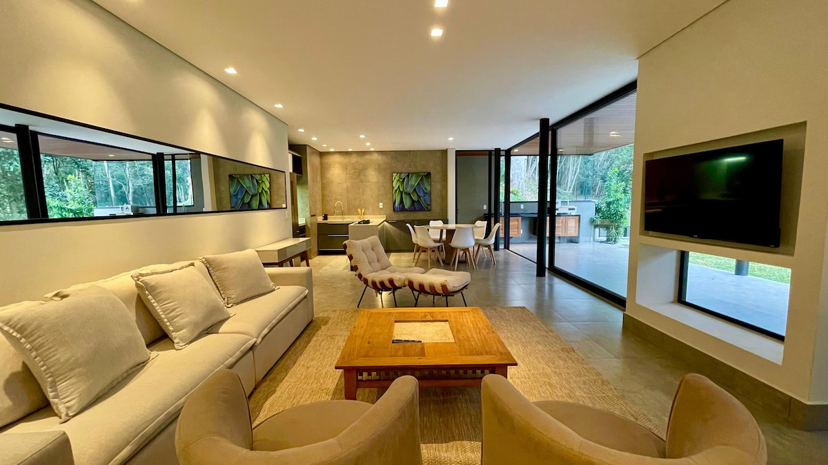 Welcome to #CurtaTere01! Cozy 3-bedroom house (2 suites + 1 bedroom with nearby bath), all with ceiling fans and heaters, plus an extra bathroom. Living room integrated with a full kitchen, 450 MB internet, deck by the river with natural pools and waterfalls, private pool, BBQ grill, pizza oven, veranda, garden, volleyball court, outdoor shower, pet-friendly area, and covered parking for 1 car. Private land of 1100 m². We look forward to welcoming you!