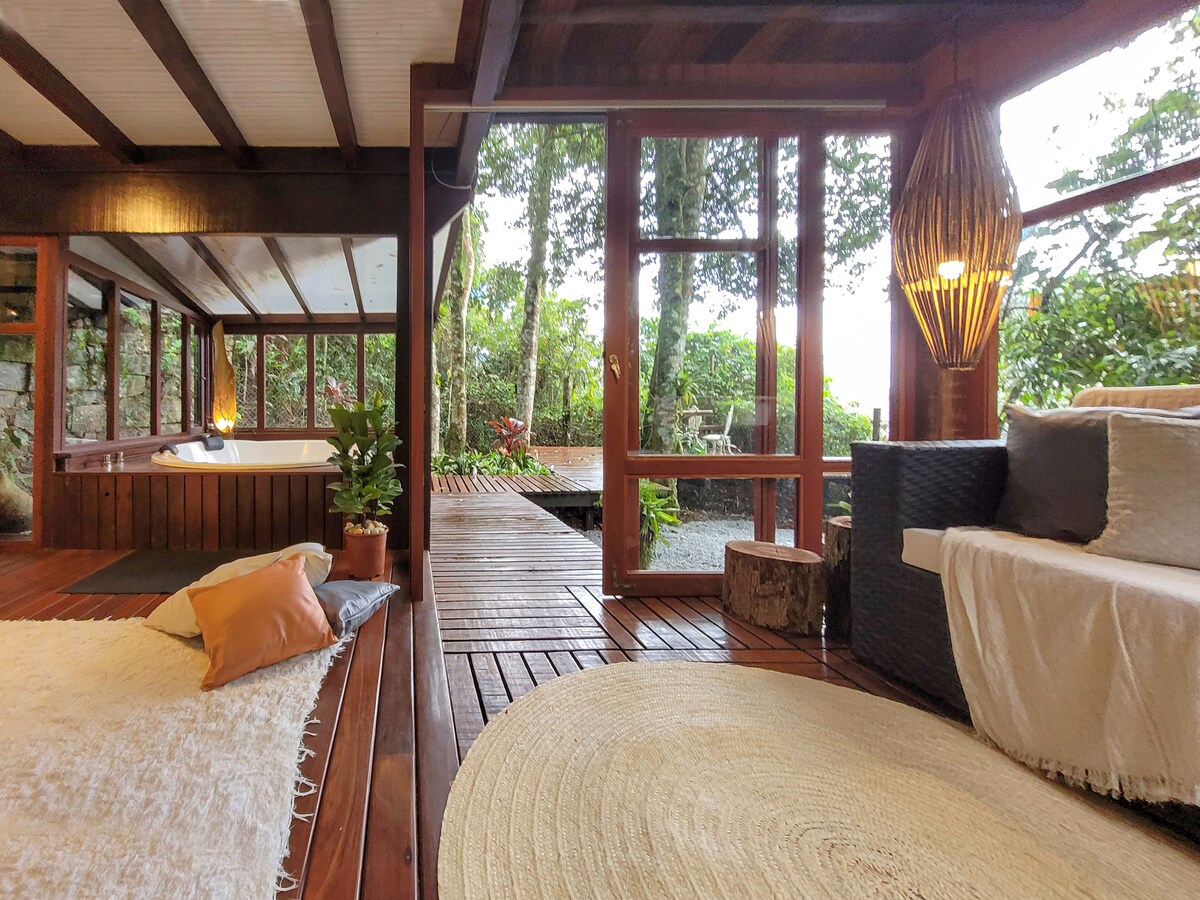 Somos o Espaço Verde Novo e este é o Chalé Ion! Banheiro amplo com vista para a mata, deck externo, jacuzzi, chuveiro aberto, cozinha equipada, cama king e lareira. Chalé totalmente privativo. Varanda com rede para curtir a vista da cachoeira e mata. Um charme perfeito para uma estadia agradável na serra de Teresópolis. Próximo a Praça do Alto. Somos o Espaço Verde Novo, siga nosso insta e sinta a paz do verde!