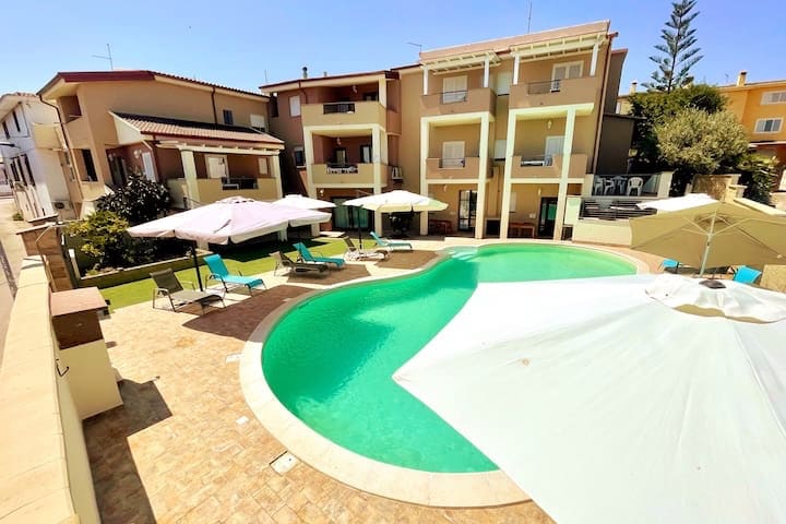 Appartamento in residence con piscina stagionale all'aperto e di una recepition. In loco parcheggio privato gratuito e una terrazza solarium con lettini. Tutte le spiagge raggiungibili tra i 5 e 10 minuti di macchina.. Composto da 1 Camera da letto, bagno con doccia, lavatrice e asciugacapelli, cucina ben attrezzata, frigorifero, forno, soggiorno con tv e divano letto, inoltre l'appartamento e dotato di un Kit spiaggia, wi-fi e aria condizionata. La struttura dista 7 km da Castelsardo.