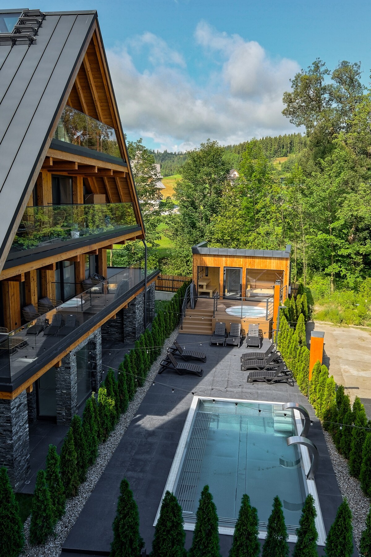 Grand Chalet to luksusowa willa o powierzchni 250 m2 w sercu Podhala z panoramicznym widokiem na Tatry. Na gości czekają: 4 klimatyzowane sypialnie, 4 łazienki, jacuzzi z widokiem, sauna, sala gier z bilardem i PS5, strefa fitness, gabinet do pracy ze światłowodem, kącik dla dzieci, kominek i całoroczny grill. Willa oferuje komfortowe zakwaterowanie dla 10 osób. Idealne miejsce na rodzinny wypoczynek, spotkania z przyjaciółmi czy workation – komfort, nowoczesność i wyjątkowy klimat w jednym.