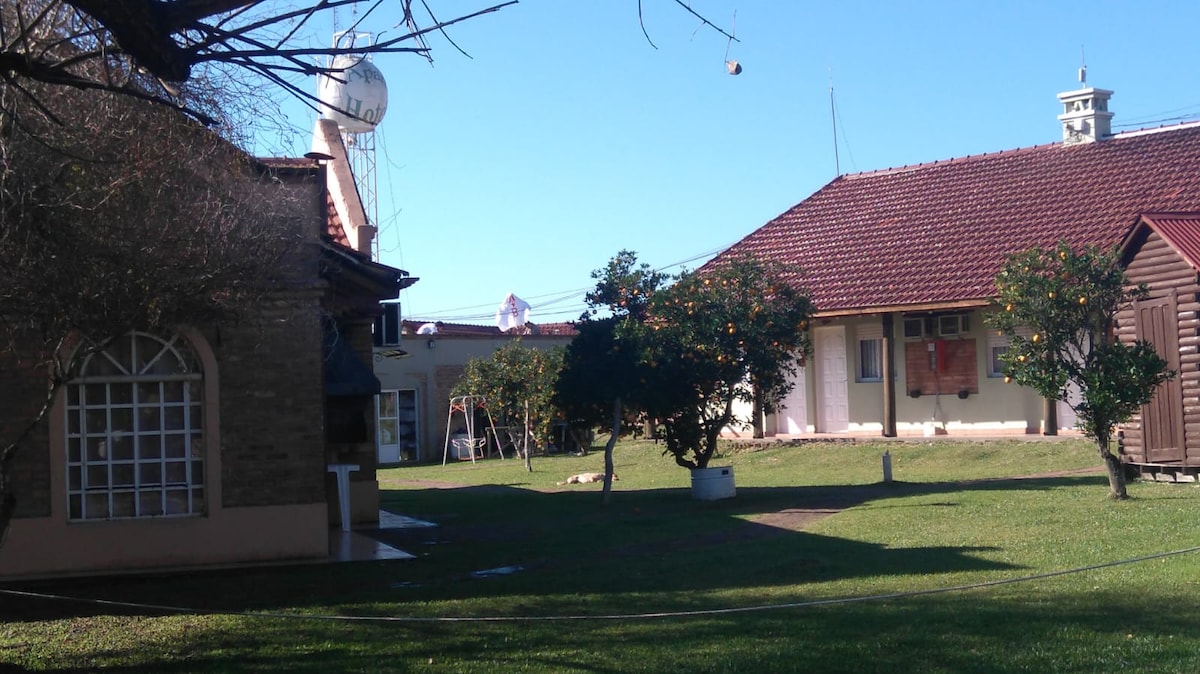 Relájate con la familia en este alojamiento donde la tranquilidad se respira. Disfruta de los días al sol y las noches bajo las estrellas. Renova la energía escuchando el canto de las aves autóctonas . A 10 min de las termas y 15 min del centro en auto. Dispone de quincho c/parrilla, pileta, espacio con reposeras al aire libre. Una cabaña equipada con DTV , WFI, aire acondicionado/calefacción. Baño, cocina, heladera, calefón a gas. La cabaña está ubicada a 20 mts de la casa familiar.
