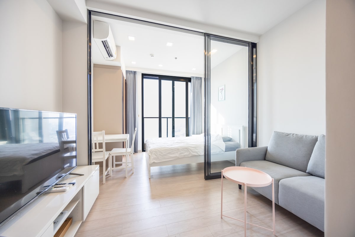 A spacious entire apartment with private bath, kitchenette, living/dining, 1 bedroom with designated working area, and balcony. Enjoy the wide windows for uninterrupted views and plenty of sunlight, increasing airiness for a more relaxing stay. Enjoy all the conveniences of city-life, including: - 5 min to BTS Asok, MRT Sukhumvit - 5 min to Terminal 21, Emporium/Emquartier and Benjasiri Park - 1 min to 7-11 convenient store - Lots of street food, cafe and taxi/bikes