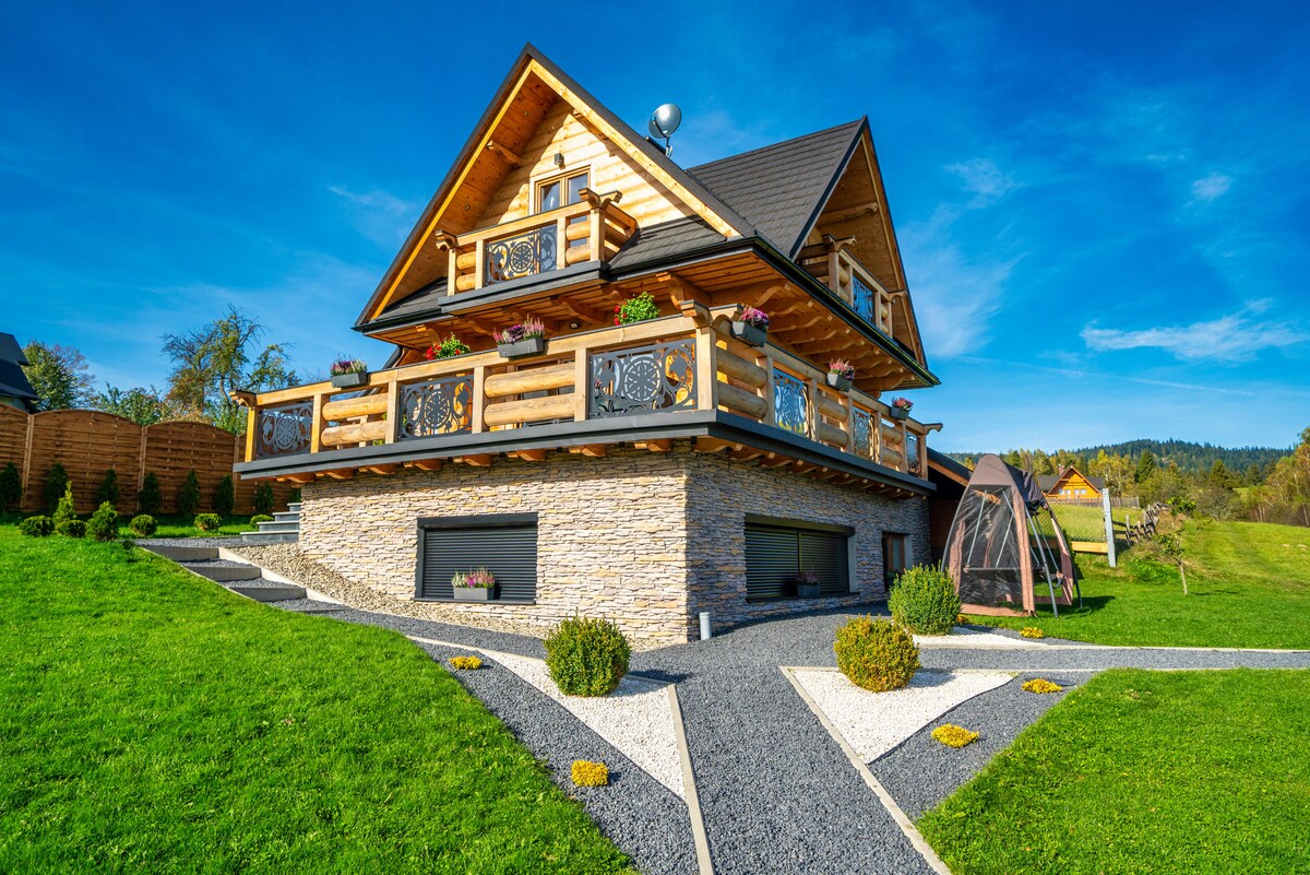 Grand Chalet to luksusowa willa o powierzchni 250 m2 w sercu Podhala z panoramicznym widokiem na Tatry. Na gości czekają: 4 klimatyzowane sypialnie, 4 łazienki, jacuzzi z widokiem, sauna, sala gier z bilardem i PS5, strefa fitness, gabinet do pracy ze światłowodem, kącik dla dzieci, kominek i całoroczny grill. Willa oferuje komfortowe zakwaterowanie dla 10 osób. Idealne miejsce na rodzinny wypoczynek, spotkania z przyjaciółmi czy workation – komfort, nowoczesność i wyjątkowy klimat w jednym.