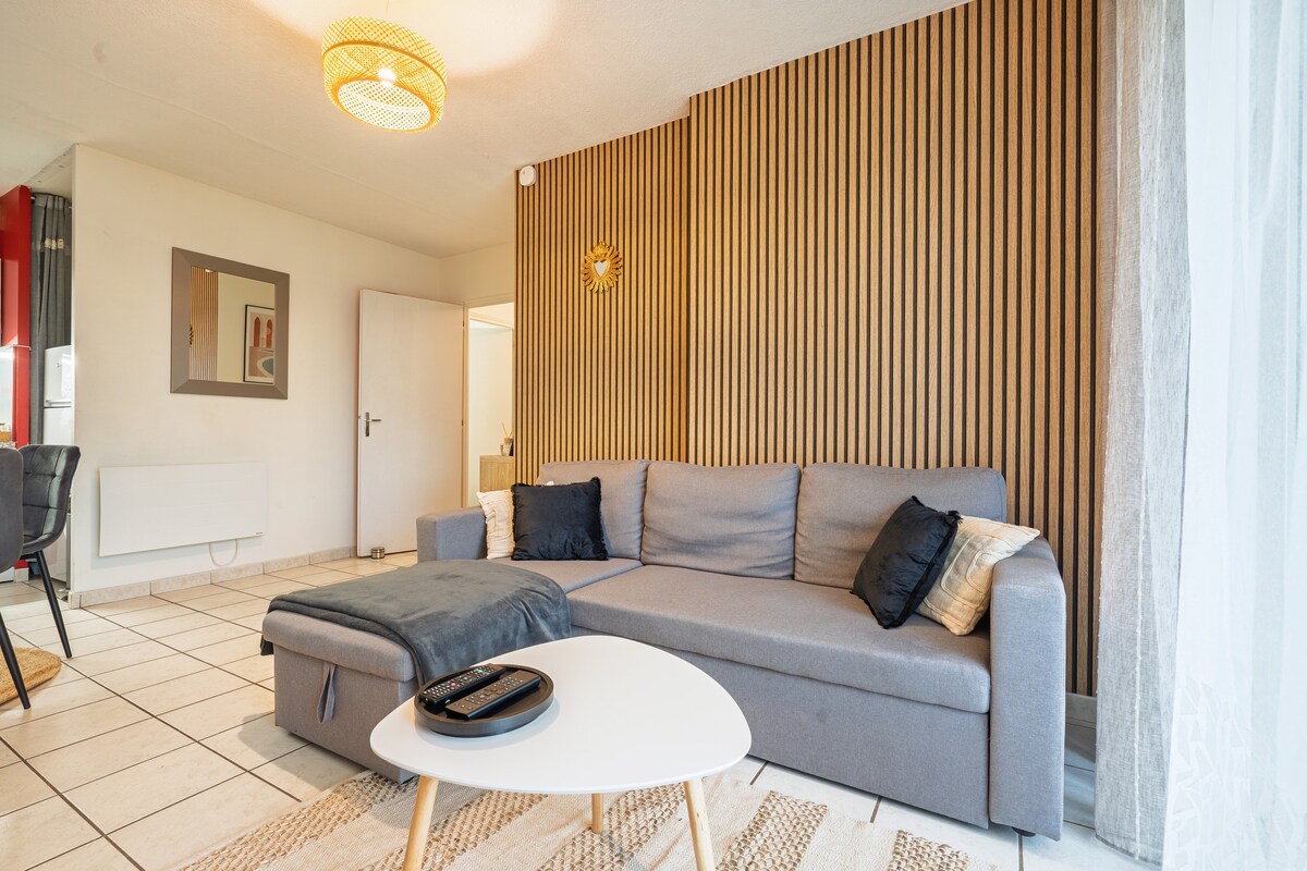 Discover "L'Oasis": 50sqm stylish duplex in Angers center. Includes a private secured garage in the building for total peace of mind. Indulge in the Spa area (sauna & whirlpool in-room) or a movie night with the projector (Netflix/Prime/Disney+) from your Queen Size bed. For longer stays, enjoy a fully equipped kitchen, modern bathroom and sofa bed in a beautifully decorated living space.