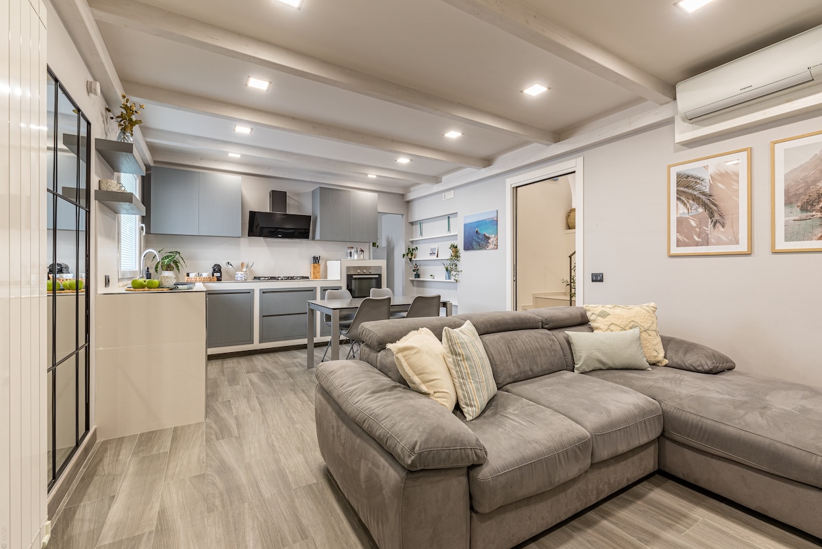 Appartamento strutturato su tre livelli così composto: piano terra soggiorno/cucina ed un bagno primo piano camera da letto con servizi e doccia annessa secondo piano soppalco con divano e letto matrimoniale. Clima, lavatrice, smart tv e wi_fi tra i comfort disponibili. Solo per chi cerca il lusso e la ricerca dei dettagli.