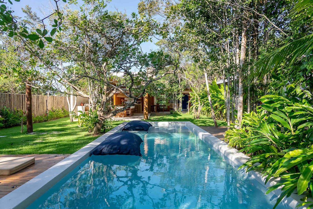 Casa nova integrada à mata, perfeita para relaxar, curtir a natureza, apreciar as flores e os pássaros, receber visitas de saguís e preguiças! Conta com 3 suítes, piscina com hidromassagem e prainha para crianças. Cozinha completa e churrasqueira. Redes para descansar em meio à natureza! A casa fica a 700 metros do quadrado de Trancoso, em poucos minutos você chega ao centro histórico da cidade! As praias estão a 1 km de distância, também acessíveis caminhando!