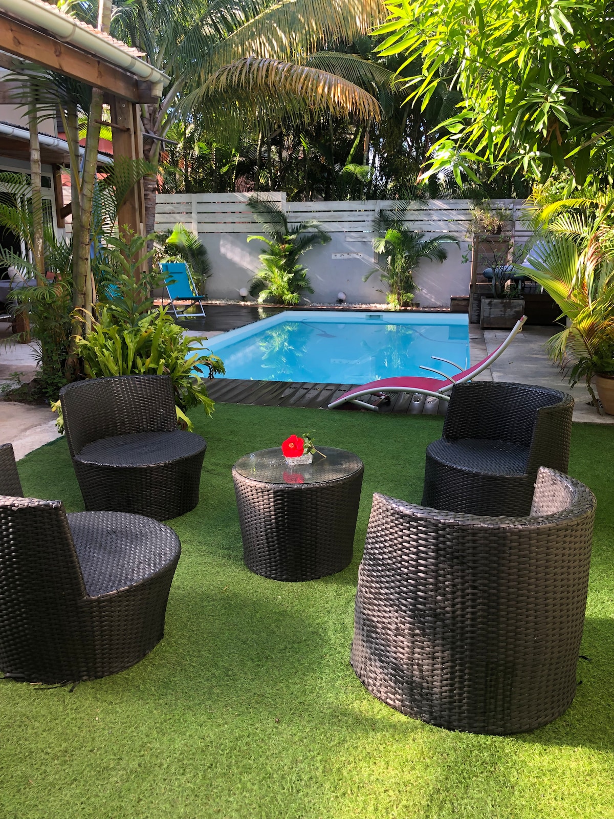 Situé dans le centre ville , dans une impasse, le studio est prévu pour 2 mais le canapé-lit peut accueillir 2 pers. supp Il se compose d'un séjour / cuisine équipée (plaque vitro, micro-onde, mach à laver, nespresso ), coin nuit avec 1 lit 140 et sde , un WC et de 2 terrasses. wifi. Le studio n'est pas climatisé, il est équipé de ventilateurs. Notre loc est 1annexe de notre maison. Proximité de la ville, des commerces des restaurants et du lagon. point de départ central pour vos randonnée