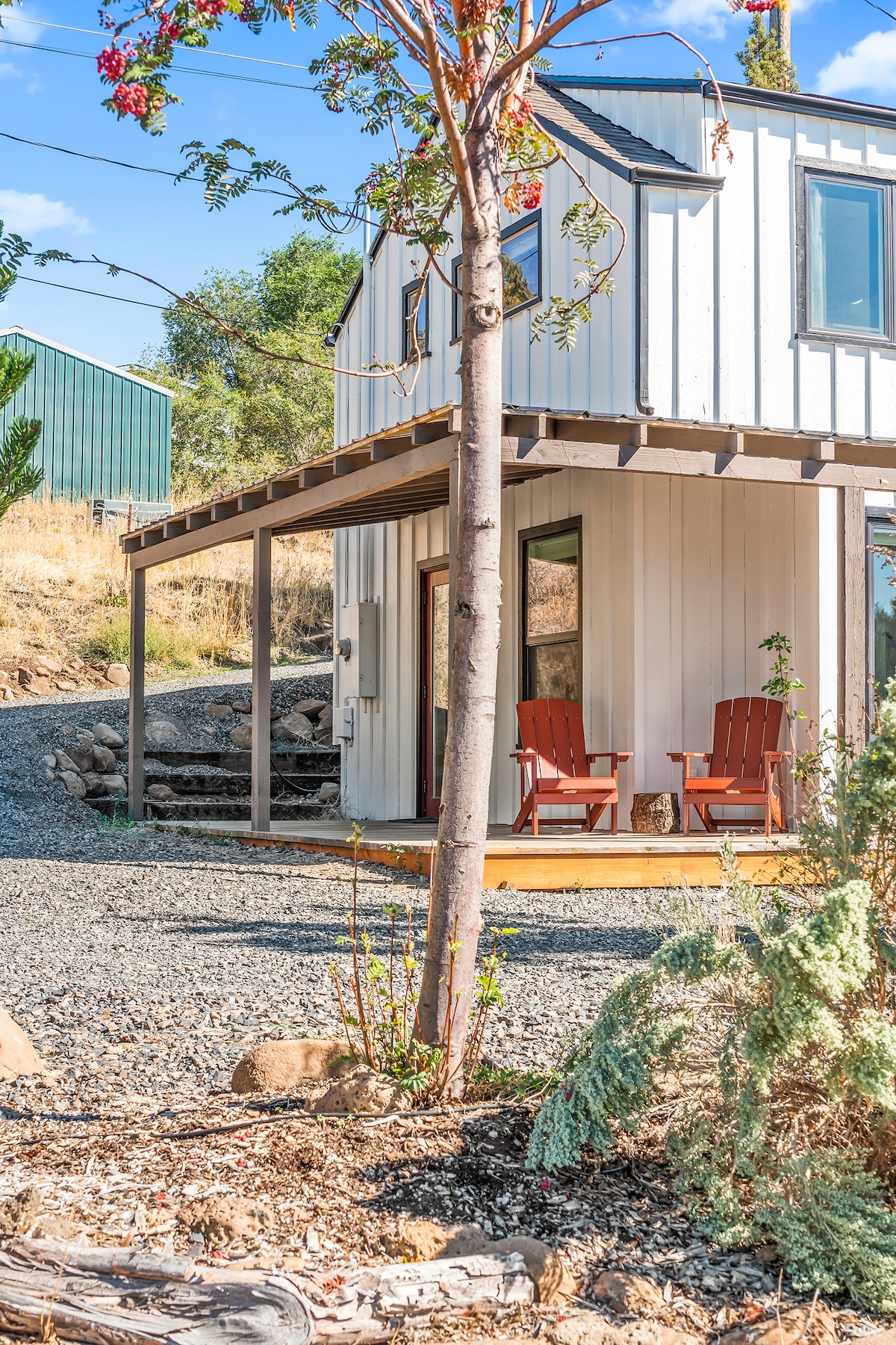 Enjoy our recently completed lofted guest house. Just 3.7 miles from smith rocks and walking distance to Terrebonne restaurants, coffee and local grocery store. Centrally located, 15 min to the airport and just a 30 min drive to Bend. Our guest house has a fully stocked kitchenette ( NO OVEN) with a toaster oven/air fryer, and an induction cook top. Sit back and relax outside in the Adirondack chairs while drinking a Nespresso coffee. Wifi is provided as well as a Roku T.V and DVD.