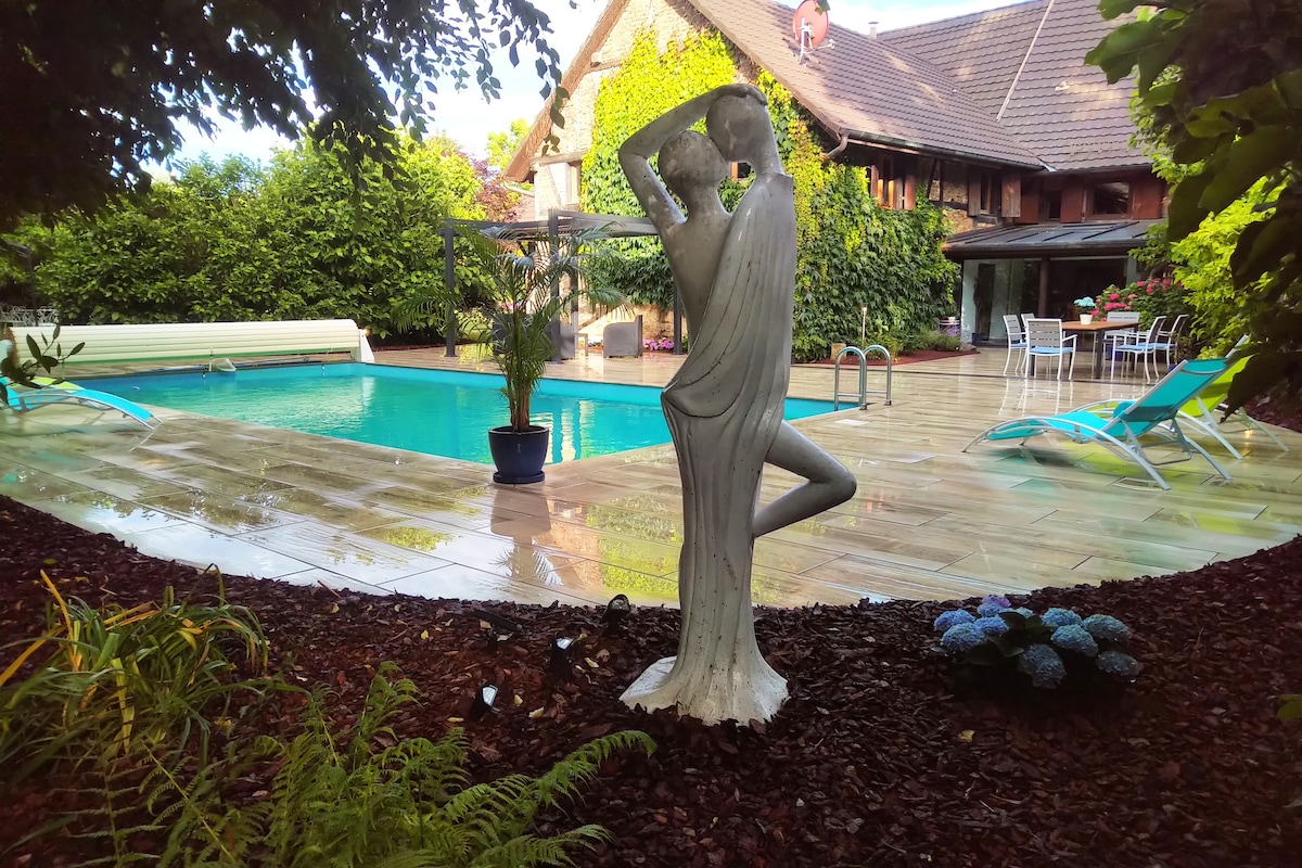 Un lieu où il est bon de venir s'y ressourcer, de se reposer au calme avec un grand jardin qui permet d'avoir de l'intimité. Demeure alsacienne atypique. Se baigner dans une grande piscine, prendre son petit déjeuner avec le chant des oiseaux, se détendre dans le jardin, sur un banc ou sous un arbre dans un hamac, prendre le temps de vivre, contempler... 85 €/nuit /chambre lit double. Idéal pour couple ou personne seule - 2 nuits min. prévoir 7,50 € /personne par petit déjeuner.
