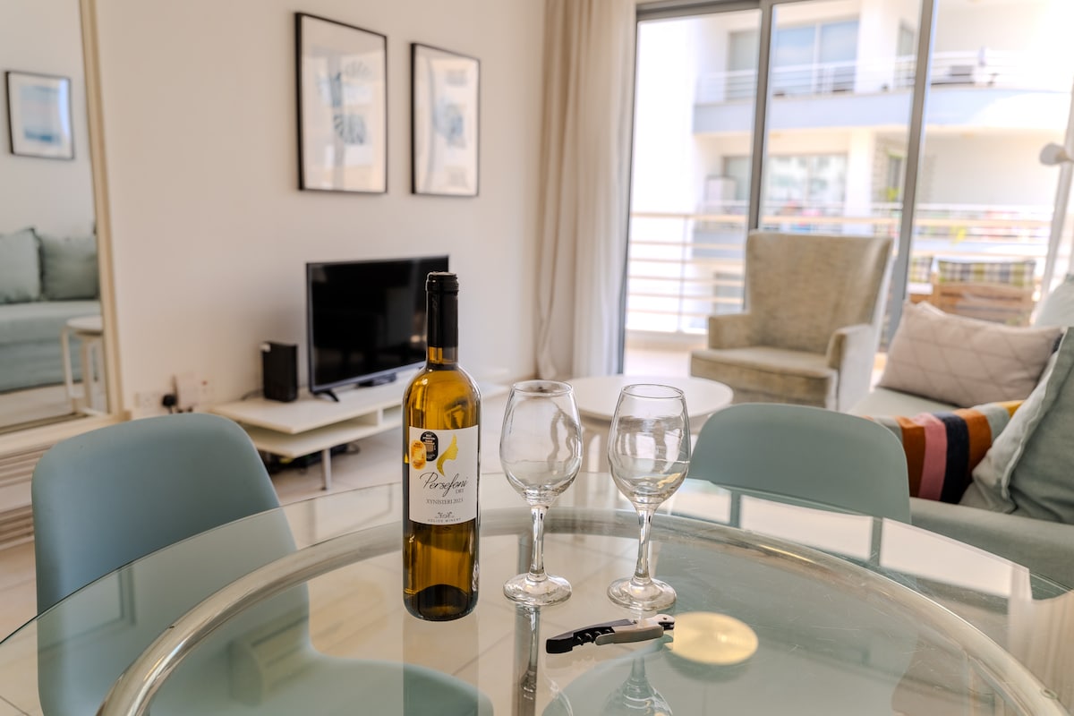 Forget your worries in this spacious and peaceful apartment with beautiful sea views. Enjoy quiet mornings on the sunny balcony, yet just a short drive to the beach (15 min by car). This coastal retreat features one modern bedroom, a fully equipped kitchen, air conditioning, Smart TV with streaming access, and free WiFi—perfect for a relaxing getaway. Cool off in the pool just steps from your door, or stay active on the on-site sports court with options for tennis or football.
