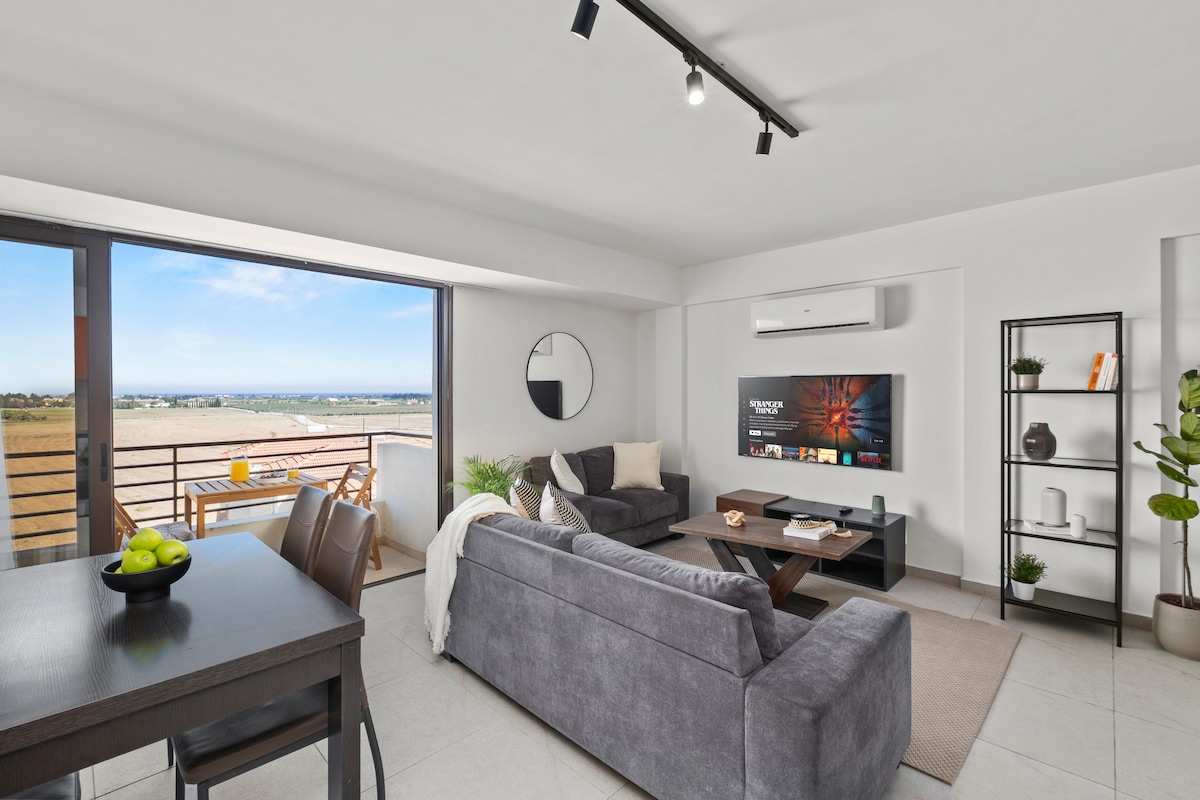 Stay, Swim, Work and Re-Charge in this peaceful and spacious space! Our cozy 1-bedroom apartment (71 sqm) in Tersefanou Village is just 10 minutes from Larnaca Airport and beautiful Careta Beach. - Fully equipped with everything you need for a hassle-free stay, including kitchen essentials, towels, pillows, bed linens... - Comfortable office space - Peaceful green surroundings for walks and cycling - Cozy balcony with pool and a little sea views - Bathroom with bathtub - Covered parking