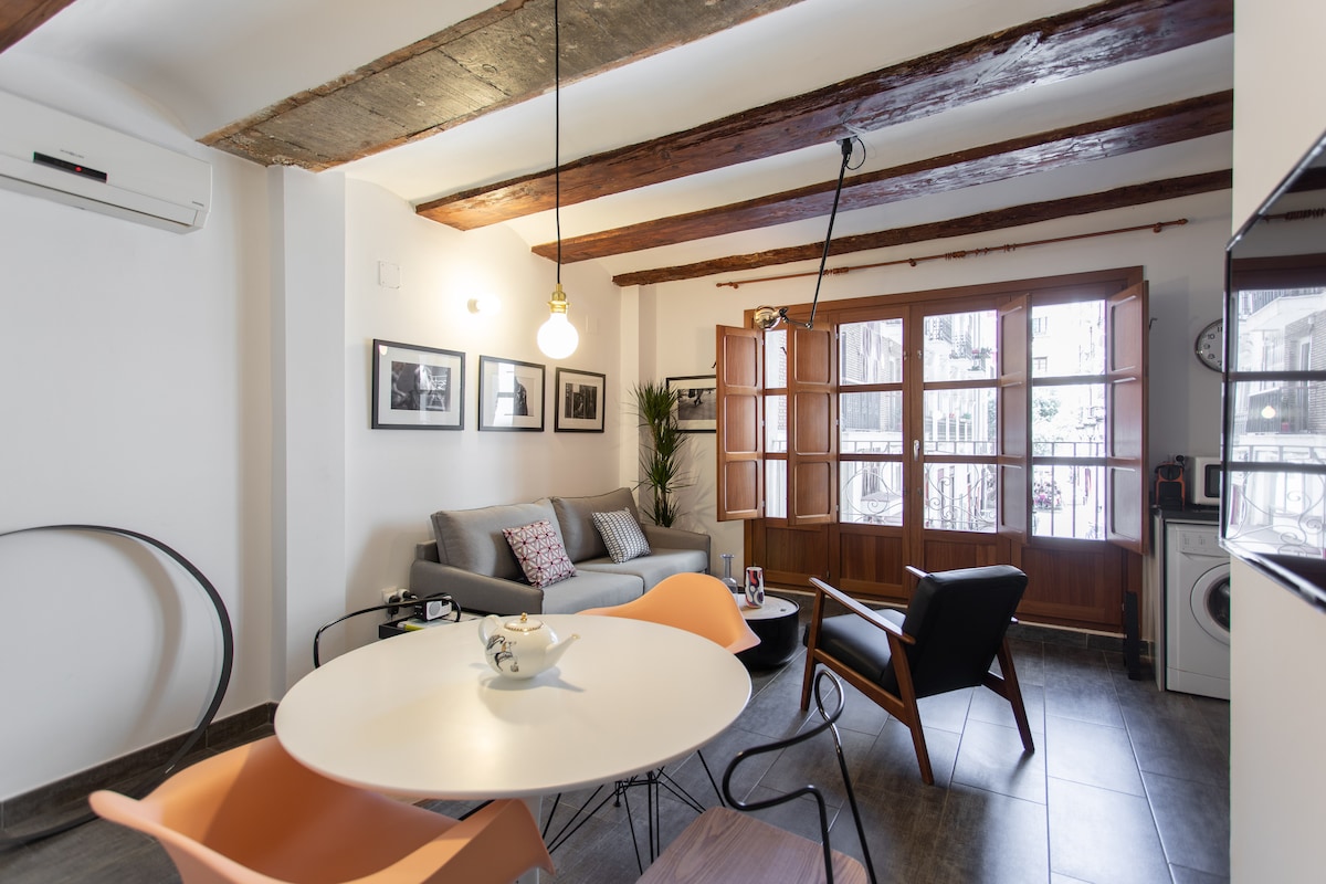 Apartamento en el corazón del casco histórico de Valencia, próximo a la Catedral, IVAM, Mercado central, La Lonja, Iglesia de San Nicolás, Museo del Carmen, el Miguelete, la Plaza de la Virgen y Torres de Quart y de Serrano entre otros. Completamente equipado, TV, sofá, terraza, comedor, cocina con microondas, vitrocerámica, nevera, baño completo, aire acondicionado, colchones viscoelásticos. WIFI GRATUITO