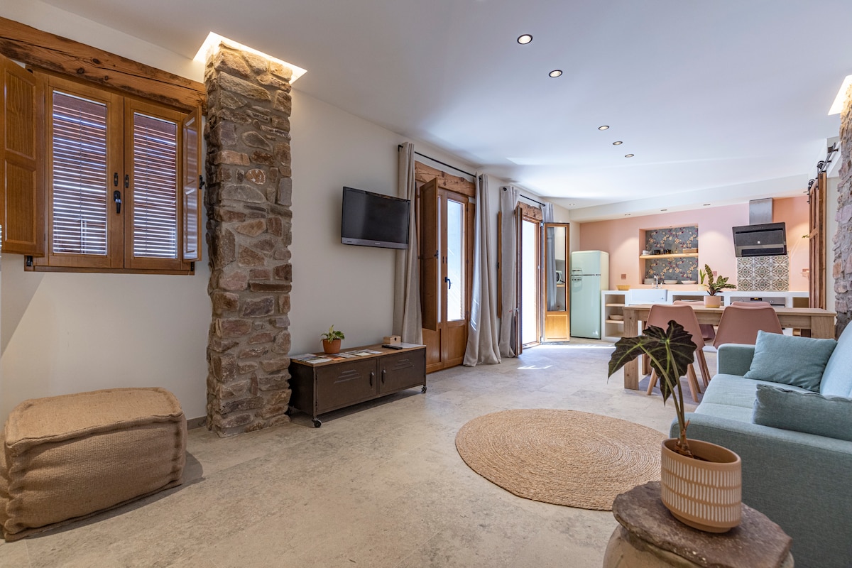 El apartamento Enea se encuentra en planta baja sin ningún escalón para su acceso, ideal para personas con menor movilidad , da directo al patio exterior donde se encuentran los servicios de lavadora, barbacoa y jacuzzi. también dispone de una bodega a la cual se puede acceder desde este apartamento. Consta de dos habitaciones salón comedor, cocina y baño. Equipado con todas las necesidades para la estancia y con una decoración estilo rustico.